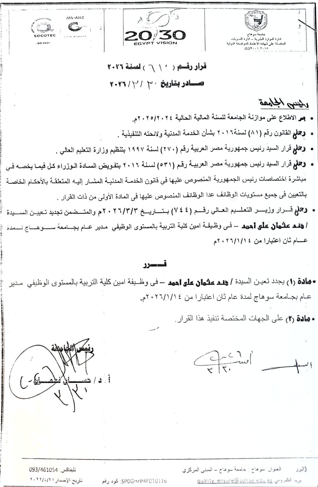 تجديد تعيين أمين كلية التربية بجامعة سوهاج لمدة عام ثانٍ
