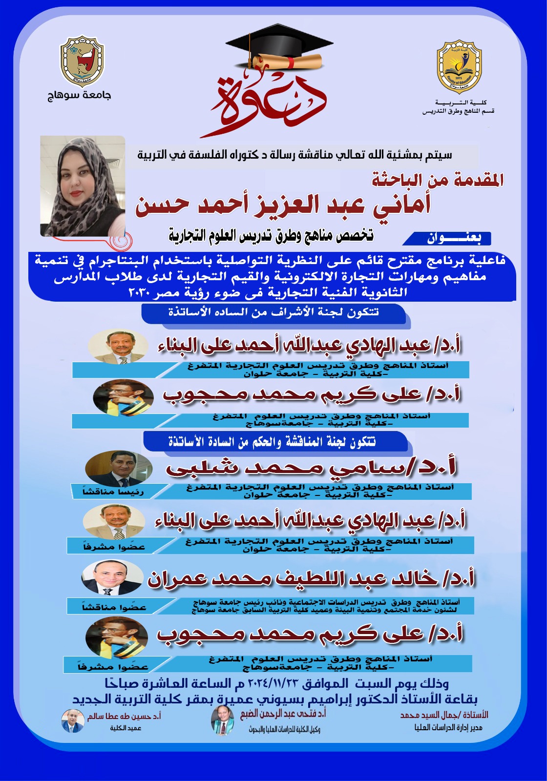 دعوة لحضور مناقشة رسالة الدكتوراه للباحثة/ أماني عبدالعزيز أحمد “تحصص المناهج وطرق التدريس”