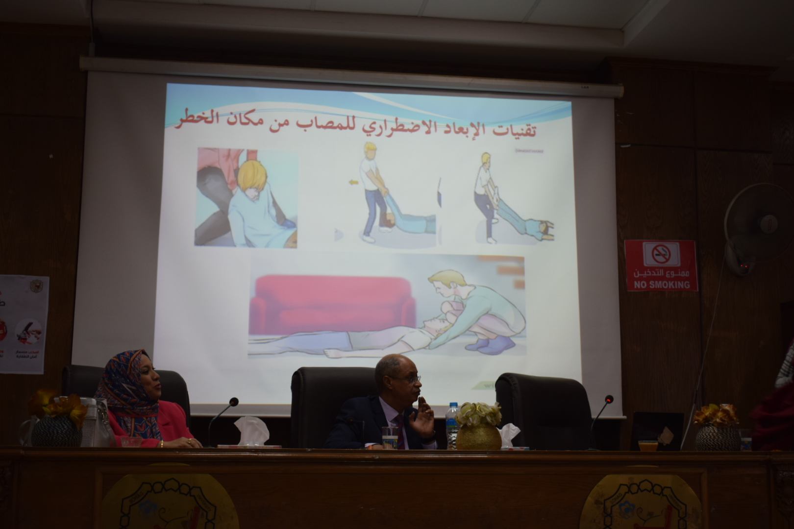 تضمنت الندوة تدريبا عمليا على الإسعافات الأولية في حالات الحوادث والكسور والتعامل مع المصابين في الأزمات والكوارث،