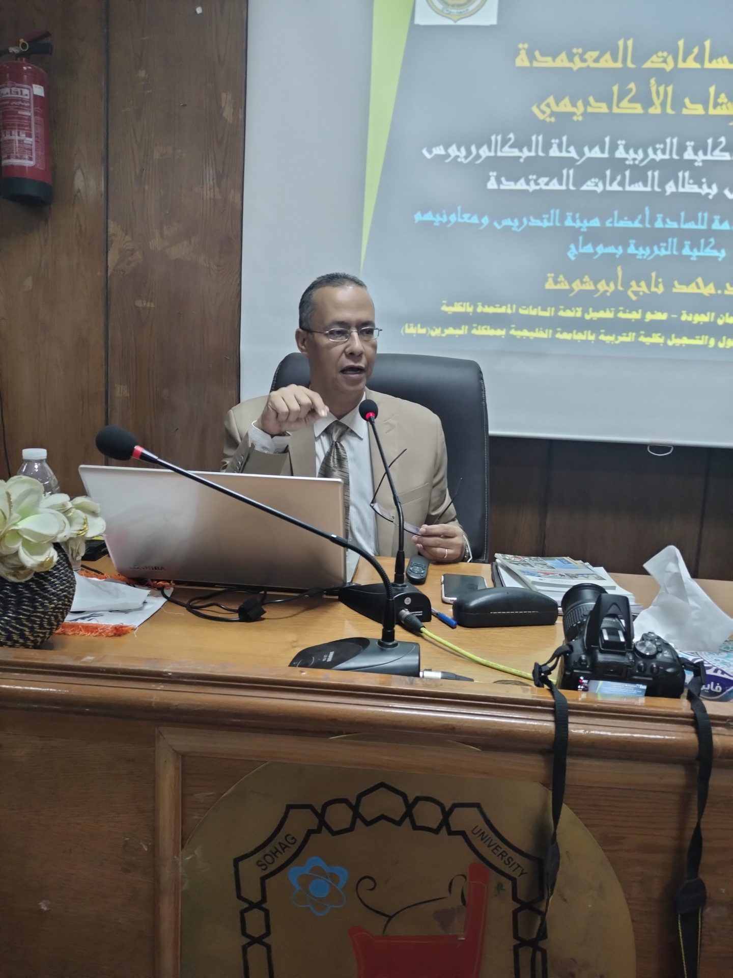 تقيم وحدة ضمان الجودة بكلية التربية ورشة عمل حول نظام الساعات المعتمدة والإرشاد الأكاديمي يحاضر فيها د. محمد ناجح