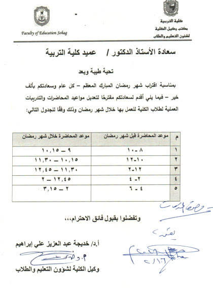 وبناءً عليه، نود إفادتكم بأنه قد تقرر تعديل مواعيد المحاضرات النظرية والتدريبات العملية، ليتوافق المسار التعليمي مع التوقيتات الخاصة بالشهر الفضيل.