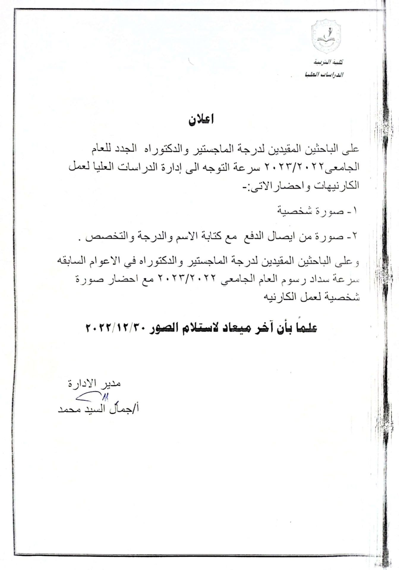 إعلان هام للباحثين المقيدين لدرجة الماجستير والدكتوراه