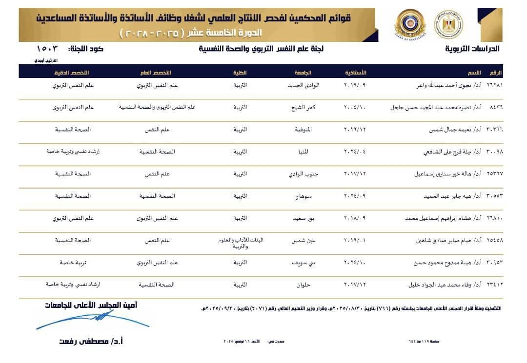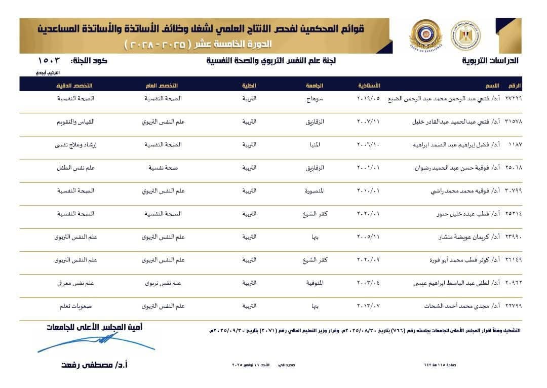 اختيار أساتذة من قسم الصحة النفسية ضمن قوائم المحكّمين لفحص الإنتاج العلمي