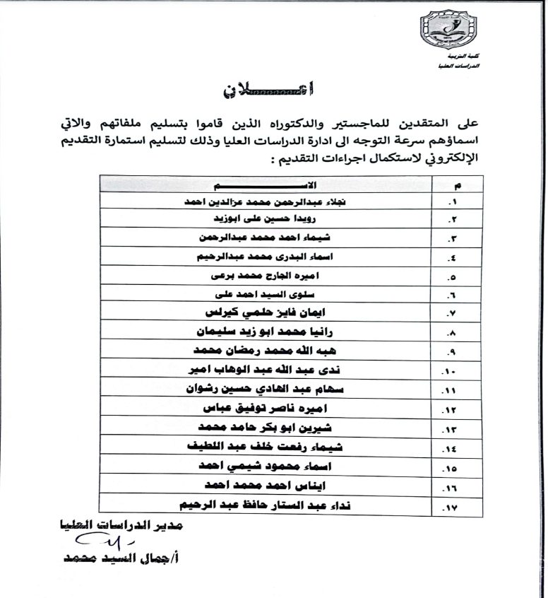الرئيسية » اعلان هام للطلاب المتقدمين للماجستير والدكتوراهاعلان هام للطلاب المتقدمين للماجستير والدكتوراهبواسطة Hoda3 سبتمبر, 2024اعلان هام للطلاب المتقدمين للماجستير والدكتوراه