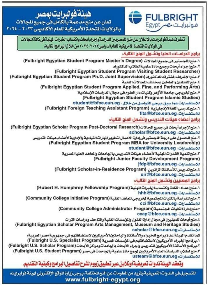 تتشرف هيئة فولبرايت بالاعلان عن منح للمصريين للدراسة واجراء ابحاث واكتساب الخبرات المهنية فى كافة المجالات فى الولايات المتحدة الامريكية للعام الدراسى 2023-2024 من خلال البرامج التالية :-