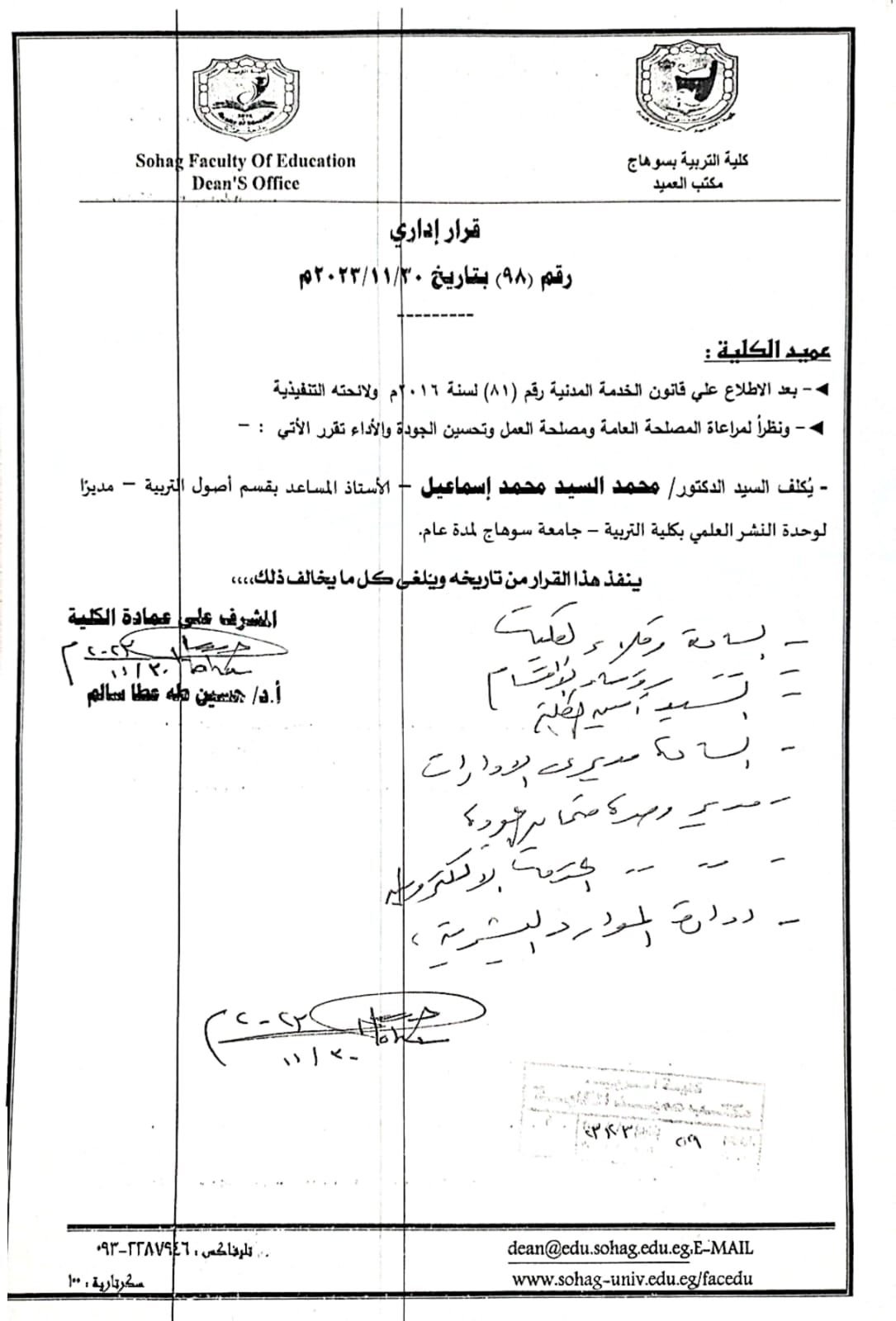 السيد الدكتور/ محمد السيد محمد مديراً لوحدة النشر العلمي بالكلية