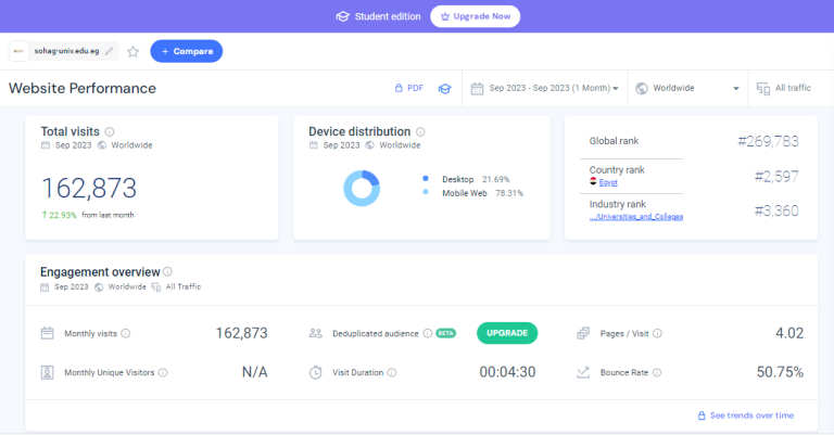 صرح الدكتور حسان النعماني رئيس جامعة سوهاج، بأن موقع الجامعة حقق تقدمًا ملحوظًا، وفقًا لتقييم موقع similar web للتحليل الرقمي، لإصدار شهر سبتمبر ٢٠٢٣ .