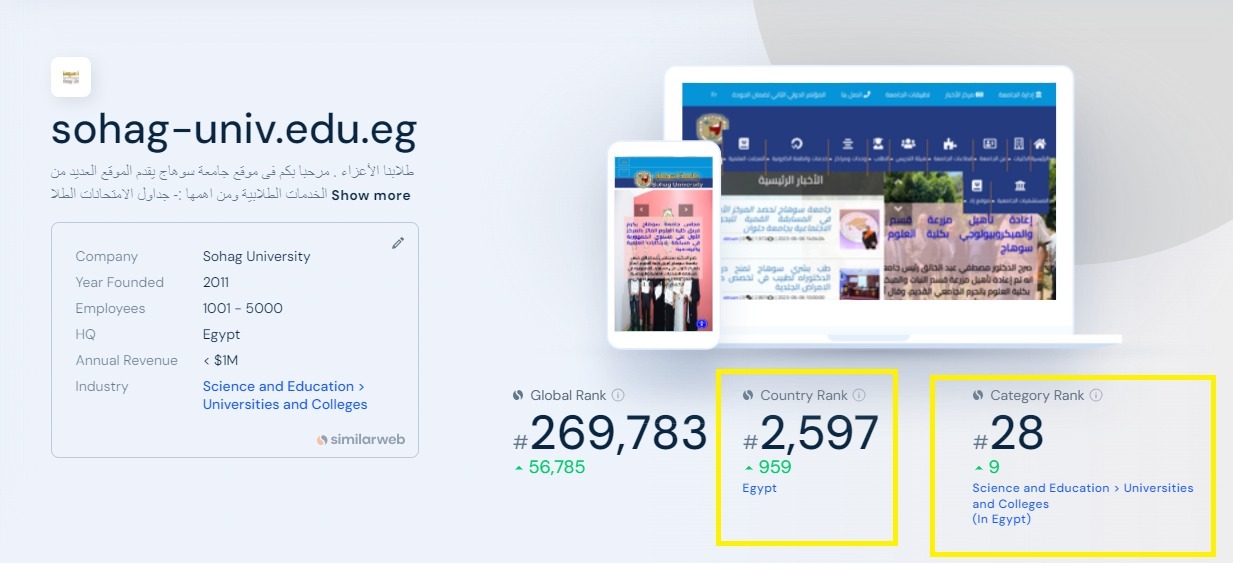 وقال رئيس جامعة سوهاج بأن موقع الجامعة تقدم 9 مراكز على مستوى الجامعات المصرية حيث أصبح في المركز الـ٢٨ بعدما كان في المركز ٣٧، وعلي مستوى المواقع الإخبارية المصرية ارتفع نحو 959 مركزا ليصبح ترتيبه 2597 ، بينما على مستوى العالم تقدم 56,785 مراكزًا ليكون في الترتيب 269,783.