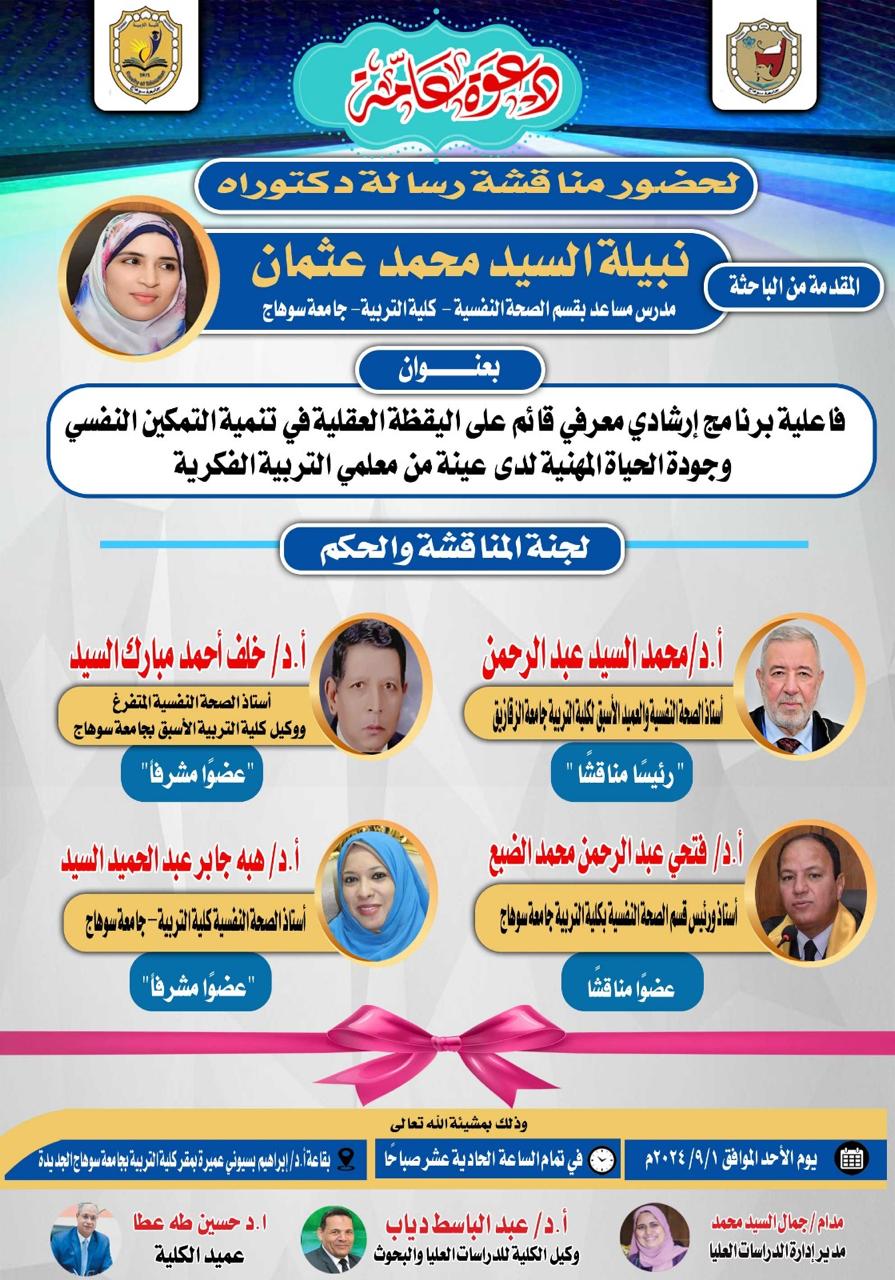 يتقدم قسم الصحة النفسية بكلية التربية جامعة سوهاج بتهنئة للدكتورة / نبيلة السيد محمد عثمان؛ المدرس المساعد بقسم الصحة النفسية؛ مناسبة حصولها علي درجة دكتوراه الفلسفة في التربية تخصص الصحة النفسية