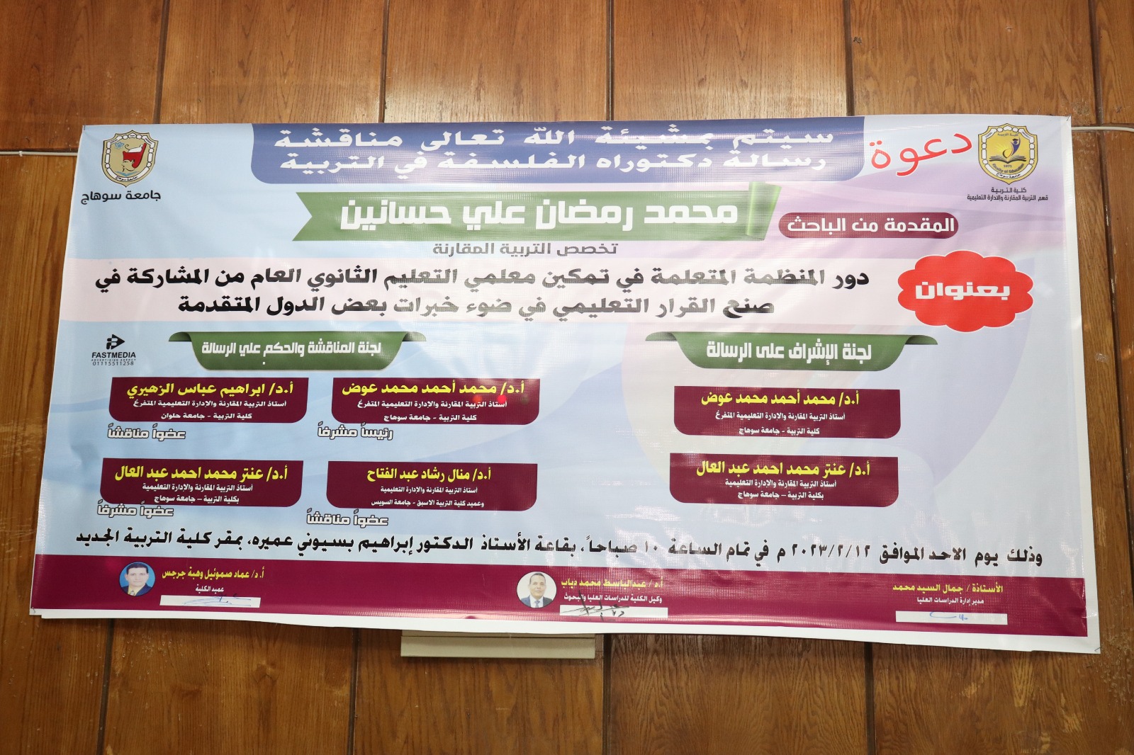 تهنئة لمناقشة رسالة الدكتوراه في التربية تخصص التربية المقارنة للباحث/محمد رمضان علي