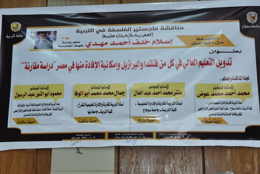 تهنئة لمناقشة رسالة الماجستير تخصص تربية مقارنة إدارة تعليمية للباحث/اسلام خلف أحمد