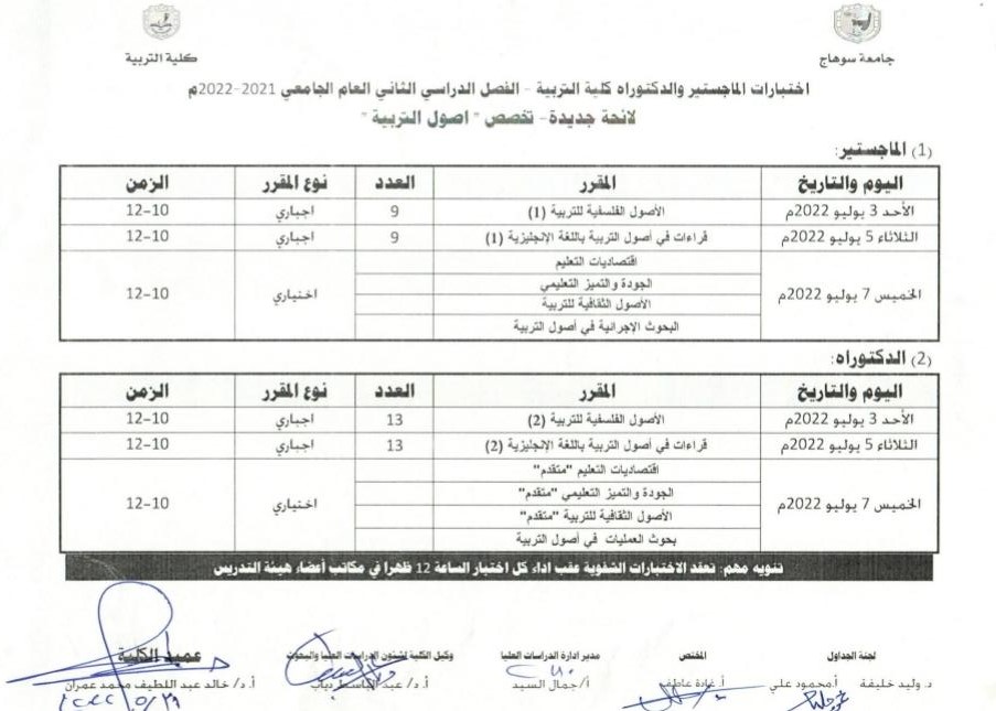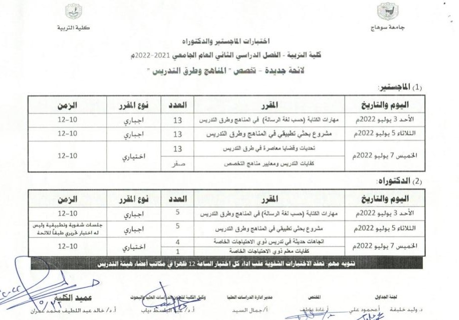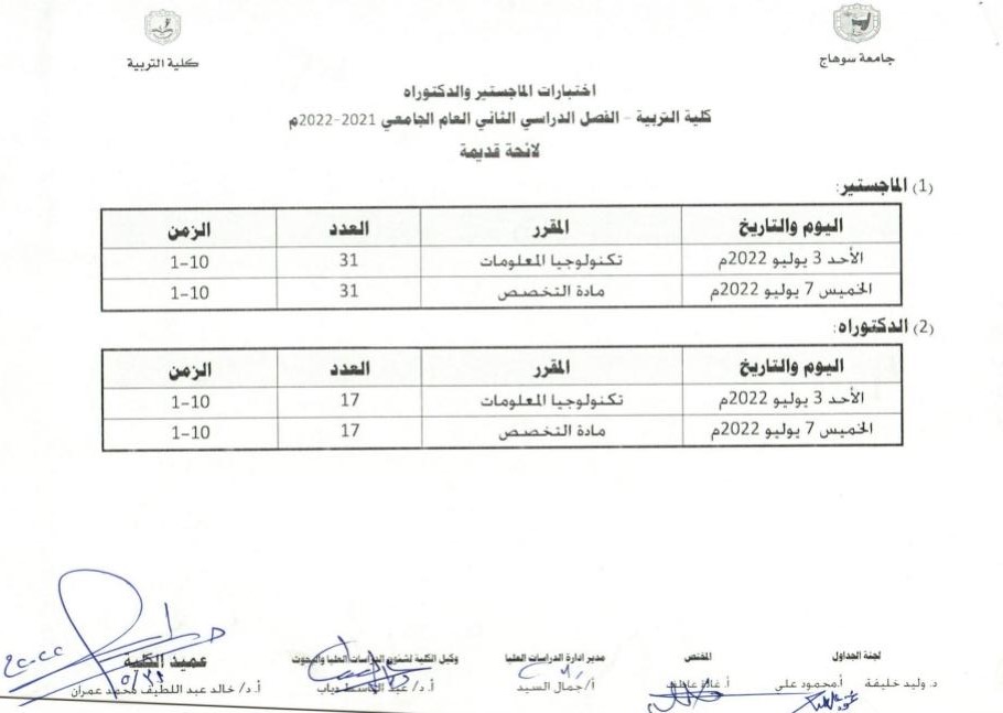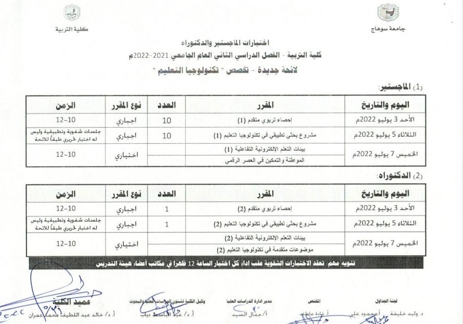 جداول امتحانات الفصل الدراسي الثاني لطلاب الماجستير والدكتوراة اللائحة القديمة و الجديدة تصفّح المقالات عزاء لسعادة الدكتور طه عمار لوفاة عمتهانطلاق مارثون امتحانات الفصل الدراسي الثاني – بكلية التربية