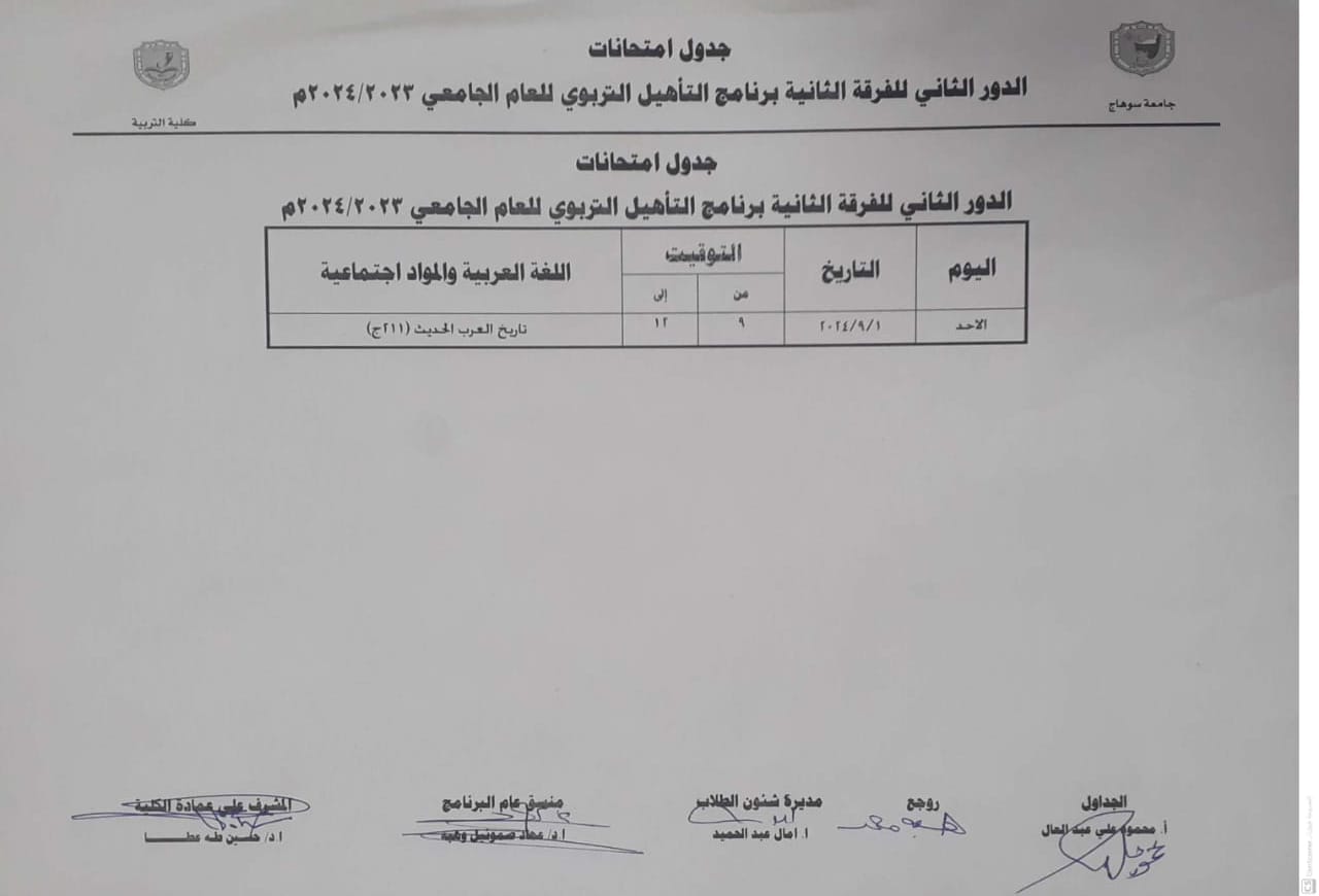 الرئيسية » جدول امتحانات الدور الثاني ببرنامج التأهيل التربوي بكلية التربيةجدول امتحانات الدور الثاني ببرنامج التأهيل التربوي بكلية التربيةبواسطة Hoda25 أغسطس, 2024جدول امتحانات الدور الثاني ببرنامج التأهيل التربوي بكلية التربية جامعة سوهاج للمستوي الثاني للعام الجامعي ٢٠٢٣م – ٢٠٢٤م