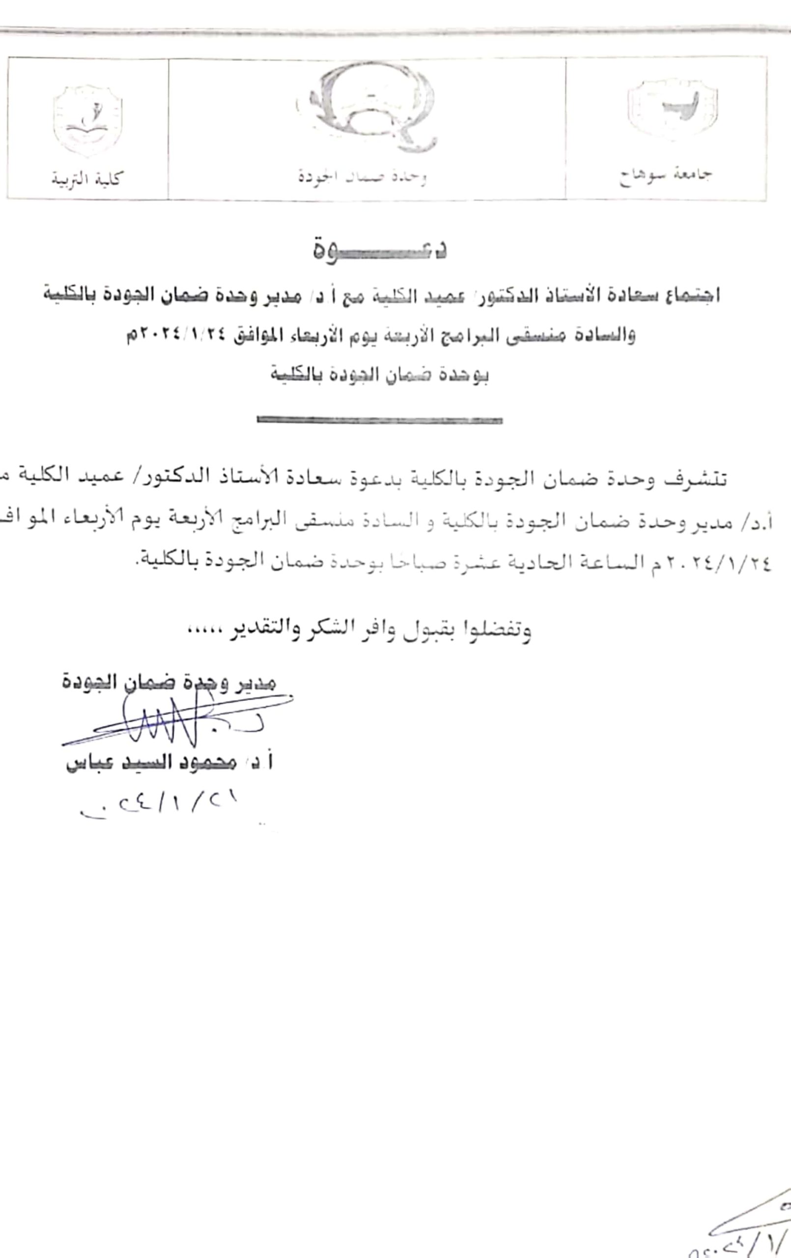 الرئيسية » دعوة لحضور اجتماع بوحدة ضمان الجودة بالكليةدعوة لحضور اجتماع بوحدة ضمان الجودة بالكليةبواسطة Hoda23 يناير, 2024دعوة لحضور اجتماع بوحدة ضمان الجودة بالكلية وذلك بمشيئة الله تعالي غداً الاربعاء الموافق 24 يناير 2024م