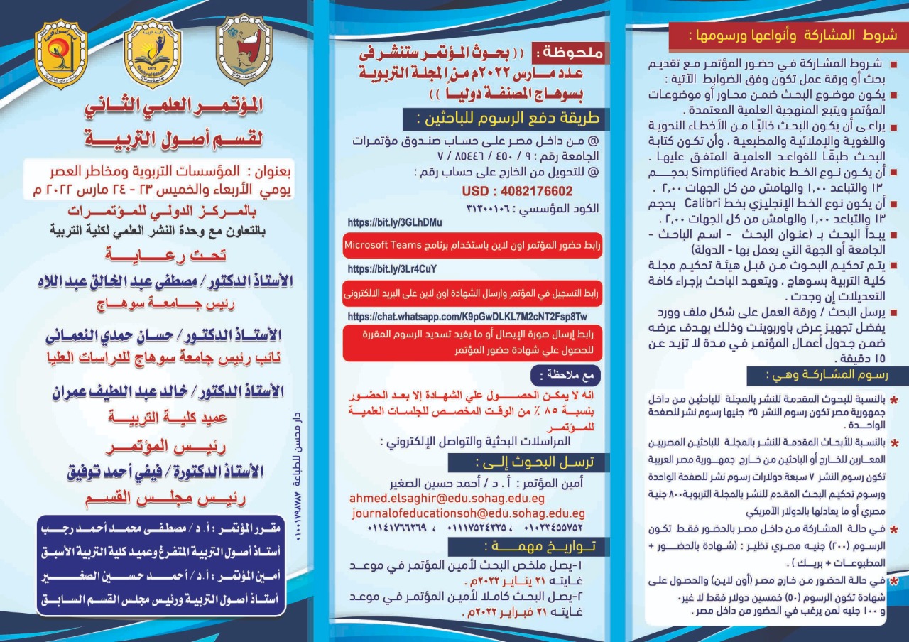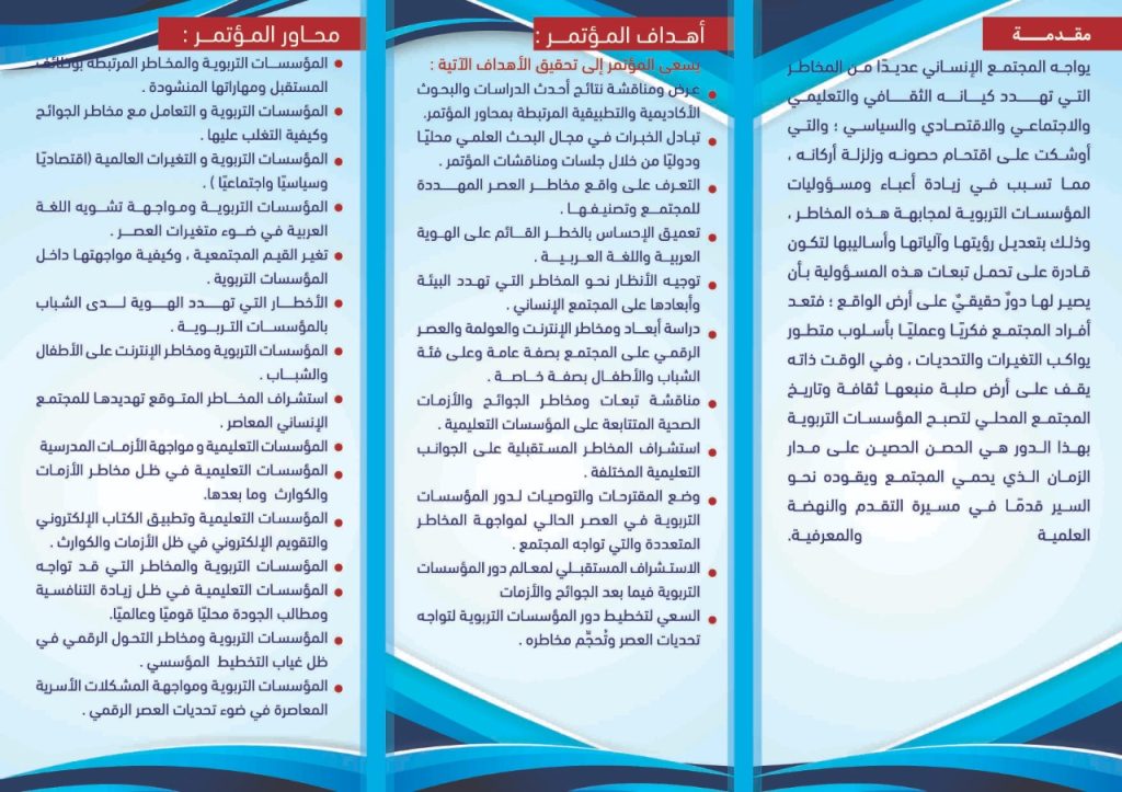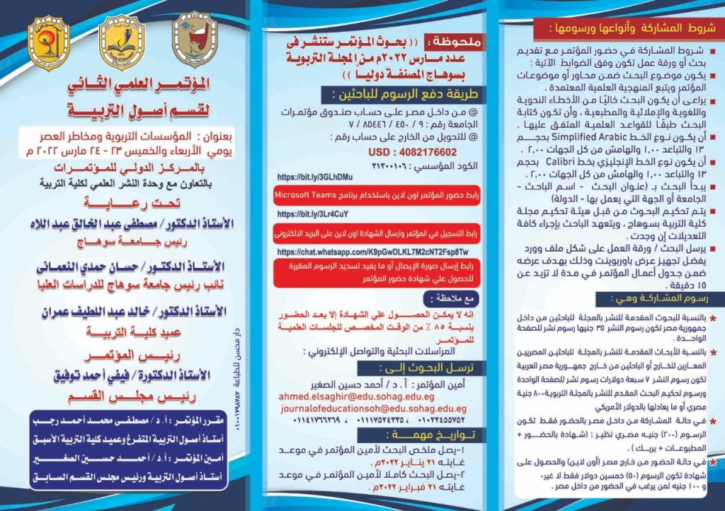 الرئيسية » دعوة لحضور المؤتمر العلمي الثاني لقسم أصول التربيةدعوة لحضور المؤتمر العلمي الثاني لقسم أصول التربيةبواسطة Dr. taha amar20 مارس, 202220 مارس, 2022