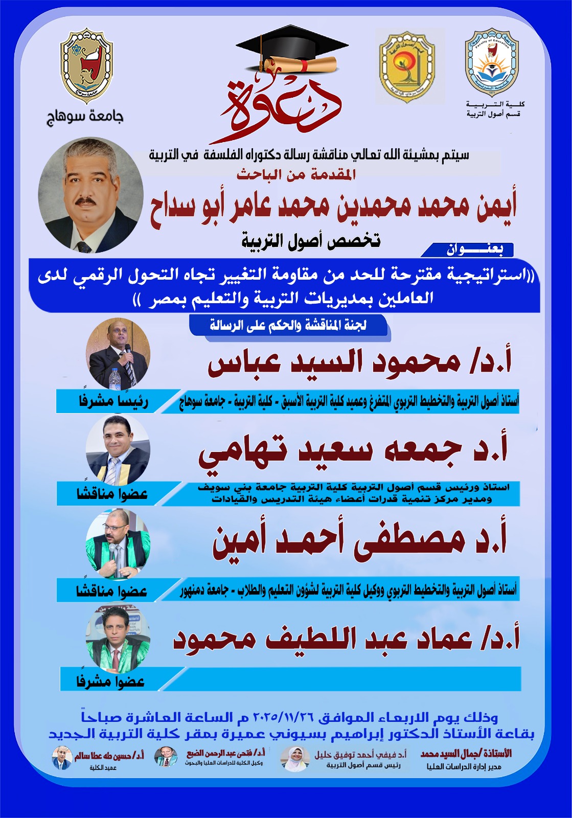 دعوة لحضور مناقشة رسالة الدكتوراه بقسم أصول التربية للباحث/ أيمن محمد