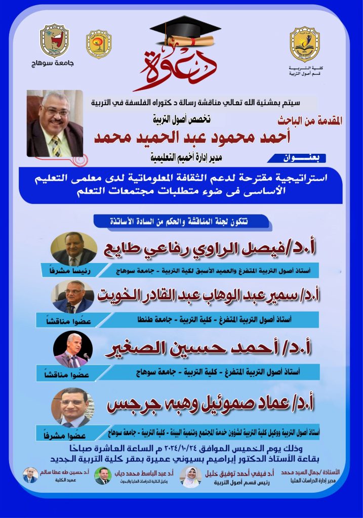 الرئيسية » دعوة لحضور مناقشة رسالة الدكتوراه تخصص أصول التربية للباحث/ أحمد محموددعوة لحضور مناقشة رسالة الدكتوراه تخصص أصول التربية للباحث/ أحمد محمودبواسطة Hoda22 أكتوبر, 202422 أكتوبر, 2024دعوة لحضور مناقشة رسالة الدكتوراه تخصص أصول التربية للباحث/ أحمد محمود عبدالحميد وذلك يوم الخميس الموافق 24 اكتوبر 2024م في تمام الساعة 10 صباحاً بقاعة أ.د/ ابراهيم بسيوني
