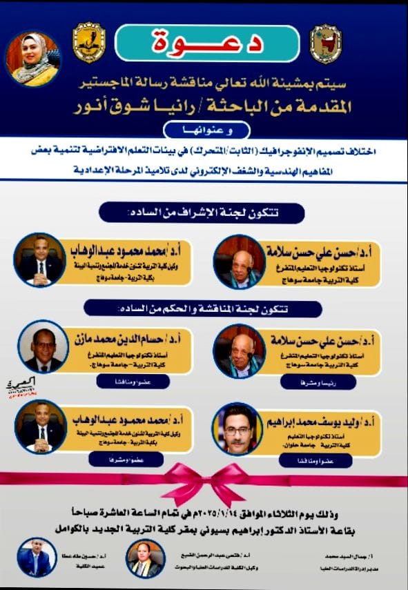 دعوة لحضور مناقشة رسالة الماجستير بقسم تكنولوجيا التعليم للباحثة/ رانيا شوق