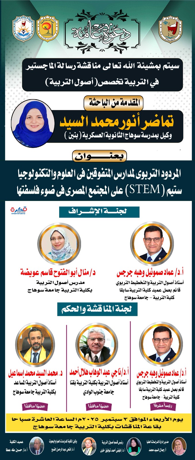 تتشرف كلية التربية – جامعة سوهاج بدعوة سيادتكم لحضور مناقشة رسالة الماجستير