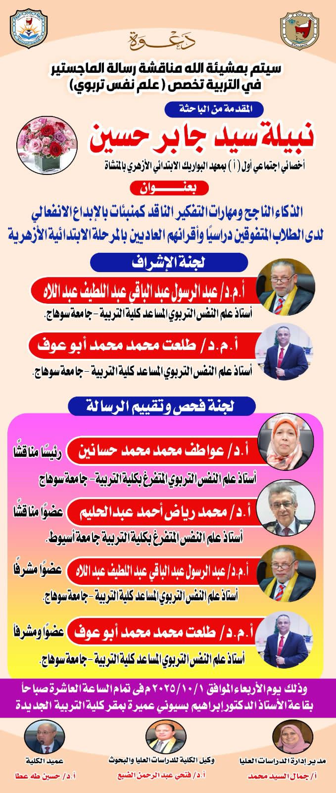 تتشرف كلية التربية – جامعة سوهاج بدعوة السادة أعضاء هيئة التدريس والهيئة المعاونة والباحثين لحضور مناقشة رسالة الماجستير في التربية (تخصص علم نفس تربوي) المقدمة من الباحثة: