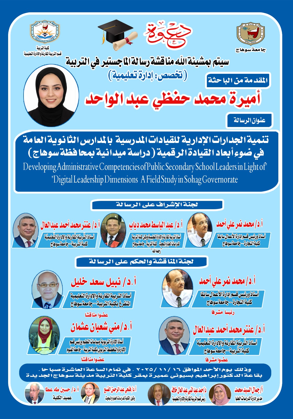 دعوة لحضور مناقشة رسالة الماجستير للباحثة/ أميرة محمد تخصص إدارة تعليمية
