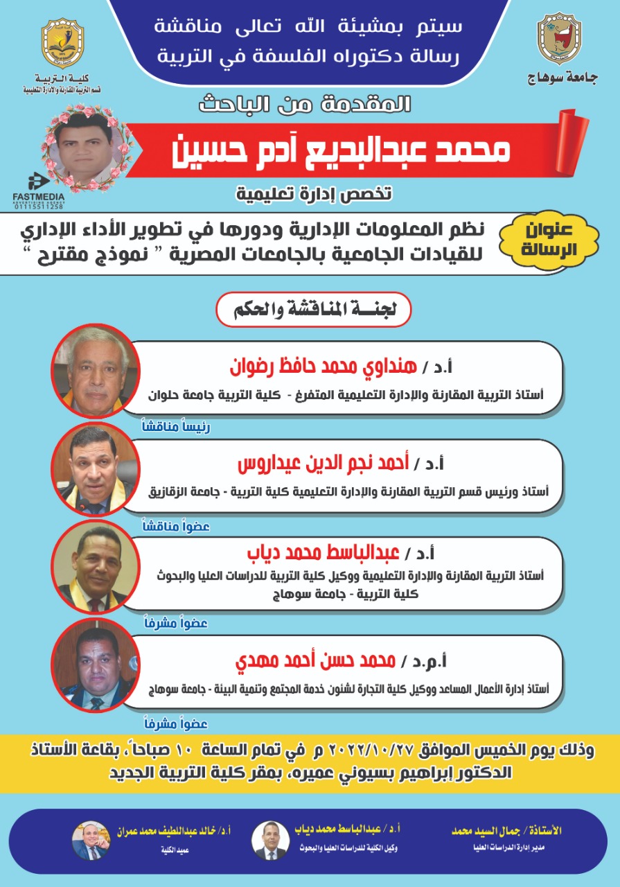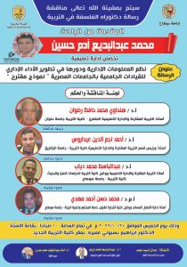 دعوة لمناقشة رسالة الدكتوراه تخصص إدارة تعليمية للباحث/محمد عبد البديع آدم