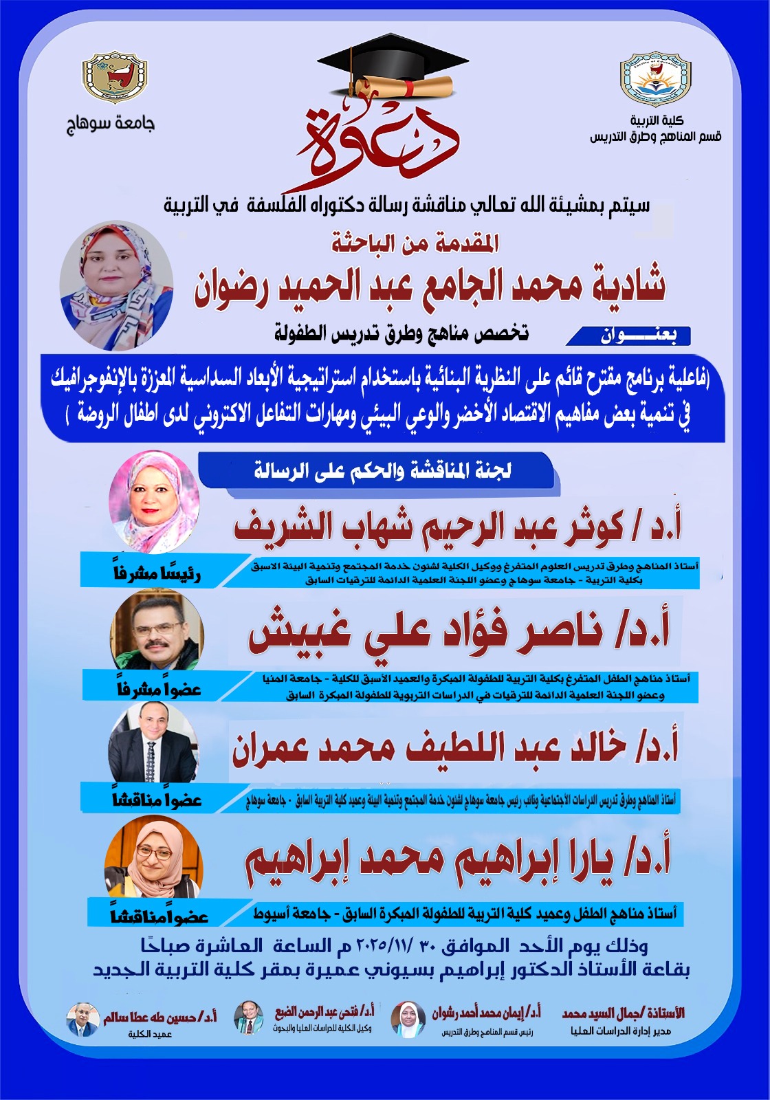 دعوة لمناقشة رسالة الدكتوراه للباحثة/ شادية محمد “تخصص مناهج وطرق تدريس”
