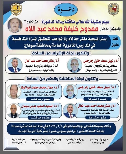 دعوة لمناقشة رسالة الدكتوراه للباحث/ ممدوح خليفة محمد تخصص الإدارة التعليمية