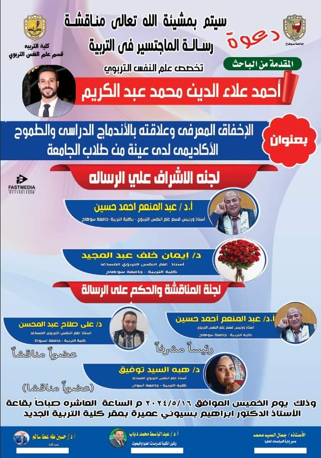 الرئيسية » دعوة لمناقشة رسالة الماجستير تخصص علم النفس التربوي للباحث/ أحمد علاء الديندعوة لمناقشة رسالة الماجستير تخصص علم النفس التربوي للباحث/ أحمد علاء الدينبواسطة Hoda9 مايو, 2024دعوة لمناقشة رسالة الماجستير في التربية تخصص علم النفس التربوي المقدمة من الباحث/ أحمد علاء الدين محمد عبدالكريم