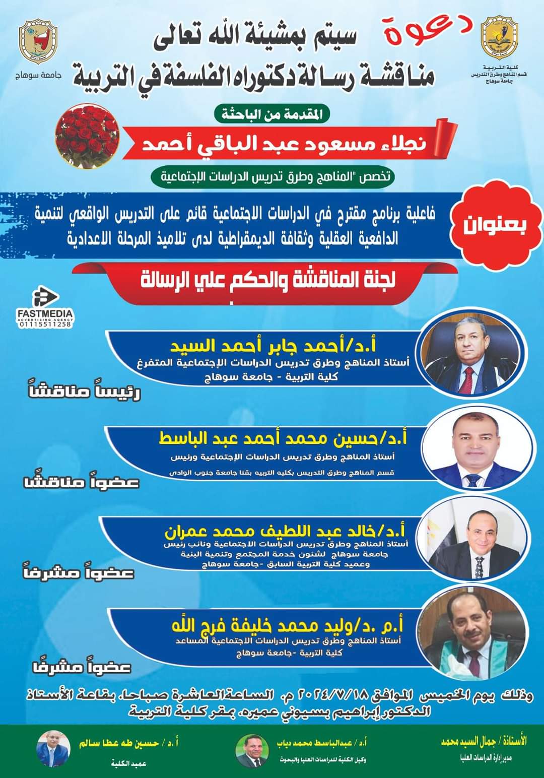 الرئيسية » دعوة لمناقشة رسالة دكتوراه الفلسفة في التربية بقسم المناهج وطرق التدريس للباحثة/ نجلاء مسعود عبدالباقيدعوة لمناقشة رسالة دكتوراه الفلسفة في التربية بقسم المناهج وطرق التدريس للباحثة/ نجلاء مسعود عبدالباقيبواسطة Hoda15 يوليو, 2024دعوة لمناقشة رسالة دكتوراه الفلسفة في التربية بقسم المناهج وطرق التدريس للباحثة/ نجلاء مسعود عبدالباقي وذلك بمشيئة الله تعالي يوم الخميس الموافق 18 يوليو 2024م