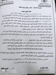 وجهت رعاية الشباب بكلية التربية ، دعوة للطلاب للمشاركة في أول هاكاثون مصري على مستوى الدولة في موضوع المدن الذكية، خلال الفترة من 24 إلى 26 مارس الجاري برعاية الدكتور خالد عبدالغفار، وزير التعليم العالي والبحث العلمي، وبالتعاون بين وزارة التعليم العالي والبحث العلمي.