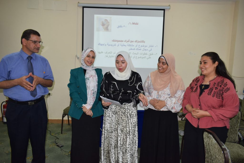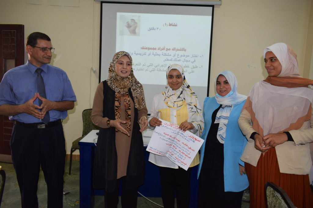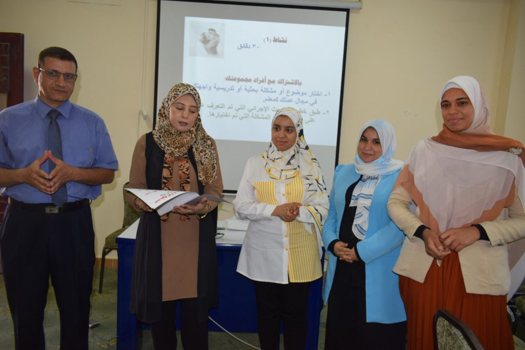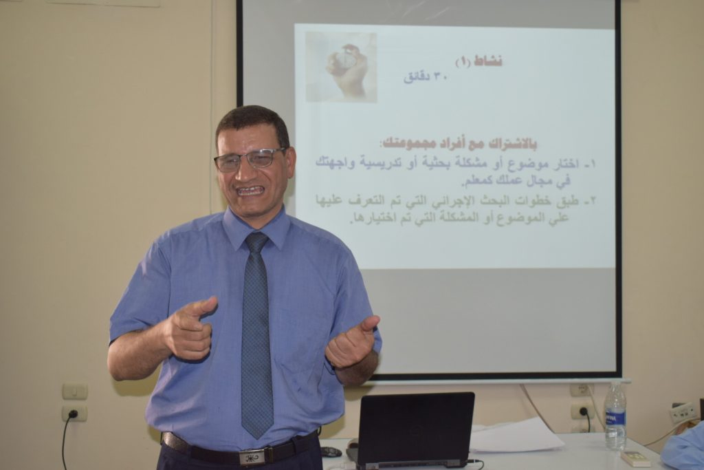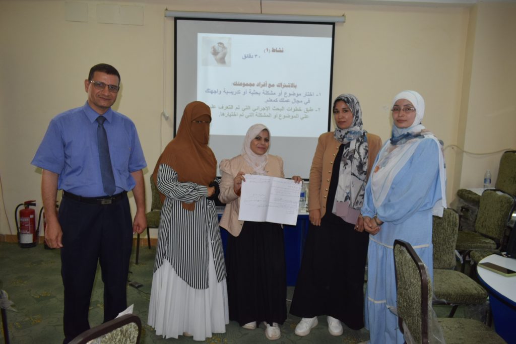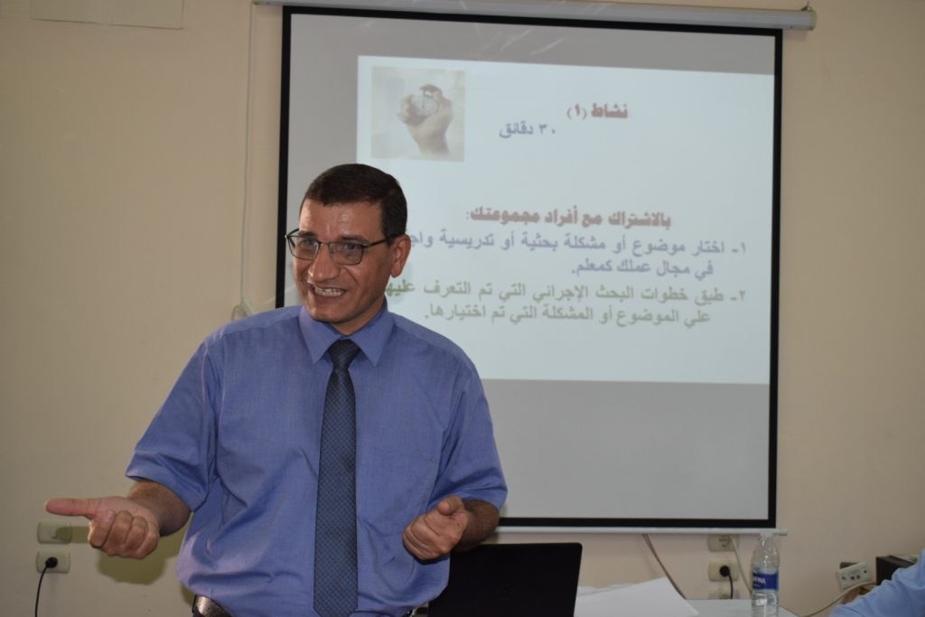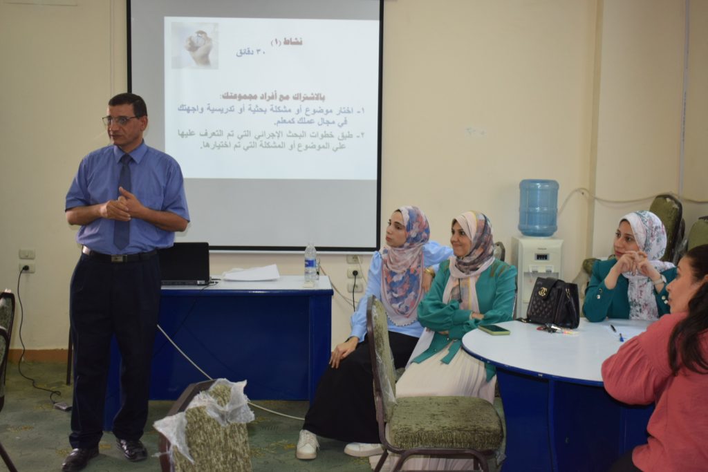 وركزت أهداف الورشة التدريبية علي تعريف المتدرب بمفاهيم البحث الإجرائي وأهم خطواته وتوضيح الفرق بين البحث الإجرائي والبحث العلمي وتقديم مجموعة من الأمثلة لموضوعات البحوث الإجرائية وبعد الانتهاء من تقديم المحتوى الخاص بالورشة التدريبية تم تكليف كل مجموعة باختيار موضوع أو مشكلة بحثية تدريسية واجهتهم في مجال عملهم وطلب منهم تطبيق خطوات البحث الإجرائي التي تم التعرف عليها أثناء الورشة التدريبية وقامت كل مجموعة بعرض الموضوع الخاص بها.