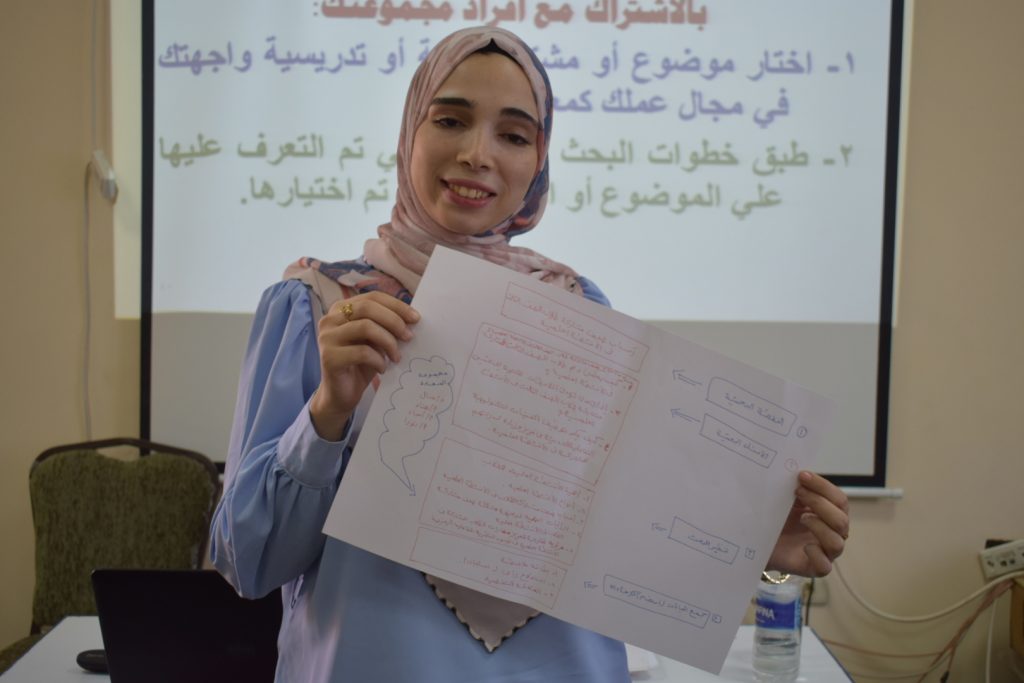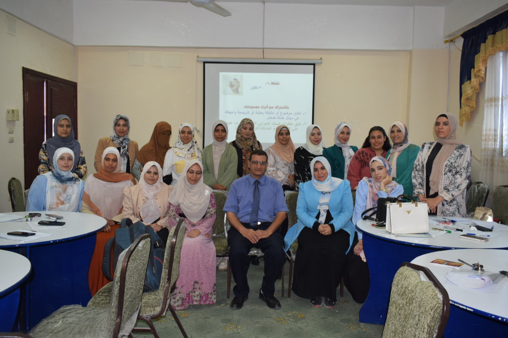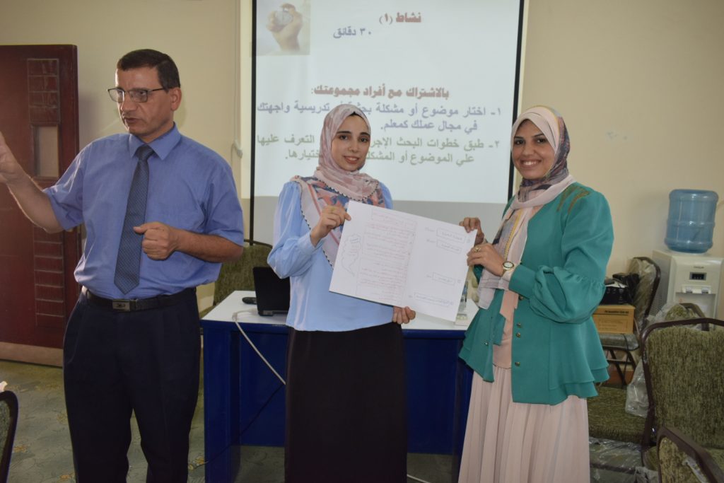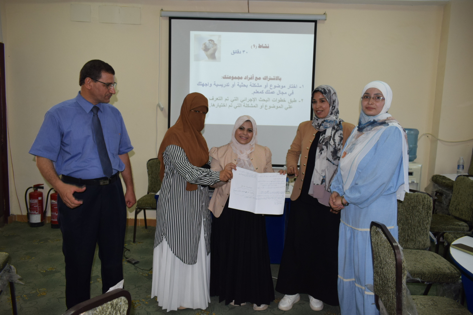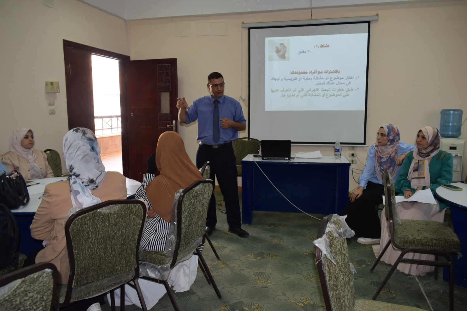 وركزت أهداف الورشة التدريبية علي تعريف المتدرب بمفاهيم البحث الإجرائي وأهم خطواته وتوضيح الفرق بين البحث الإجرائي والبحث العلمي وتقديم مجموعة من الأمثلة لموضوعات البحوث الإجرائية وبعد الانتهاء من تقديم المحتوى الخاص بالورشة التدريبية تم تكليف كل مجموعة باختيار موضوع أو مشكلة بحثية تدريسية واجهتهم في مجال عملهم وطلب منهم تطبيق خطوات البحث الإجرائي التي تم التعرف عليها أثناء الورشة التدريبية وقامت كل مجموعة بعرض الموضوع الخاص بها.