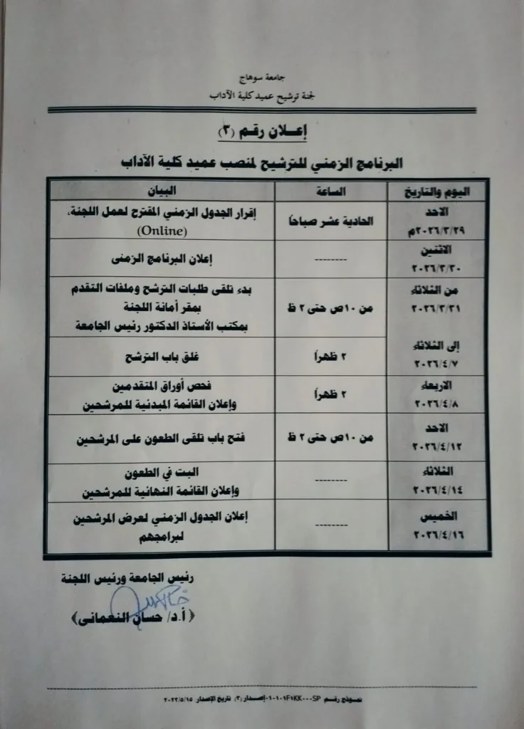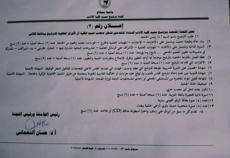 تعلن جامعة سوهاج عن فتح باب الترشح لشغل وظيفة عميد كلية الآداب ، وذلك وفقًا للإعلانات أرقام (1) و(2) و(3).