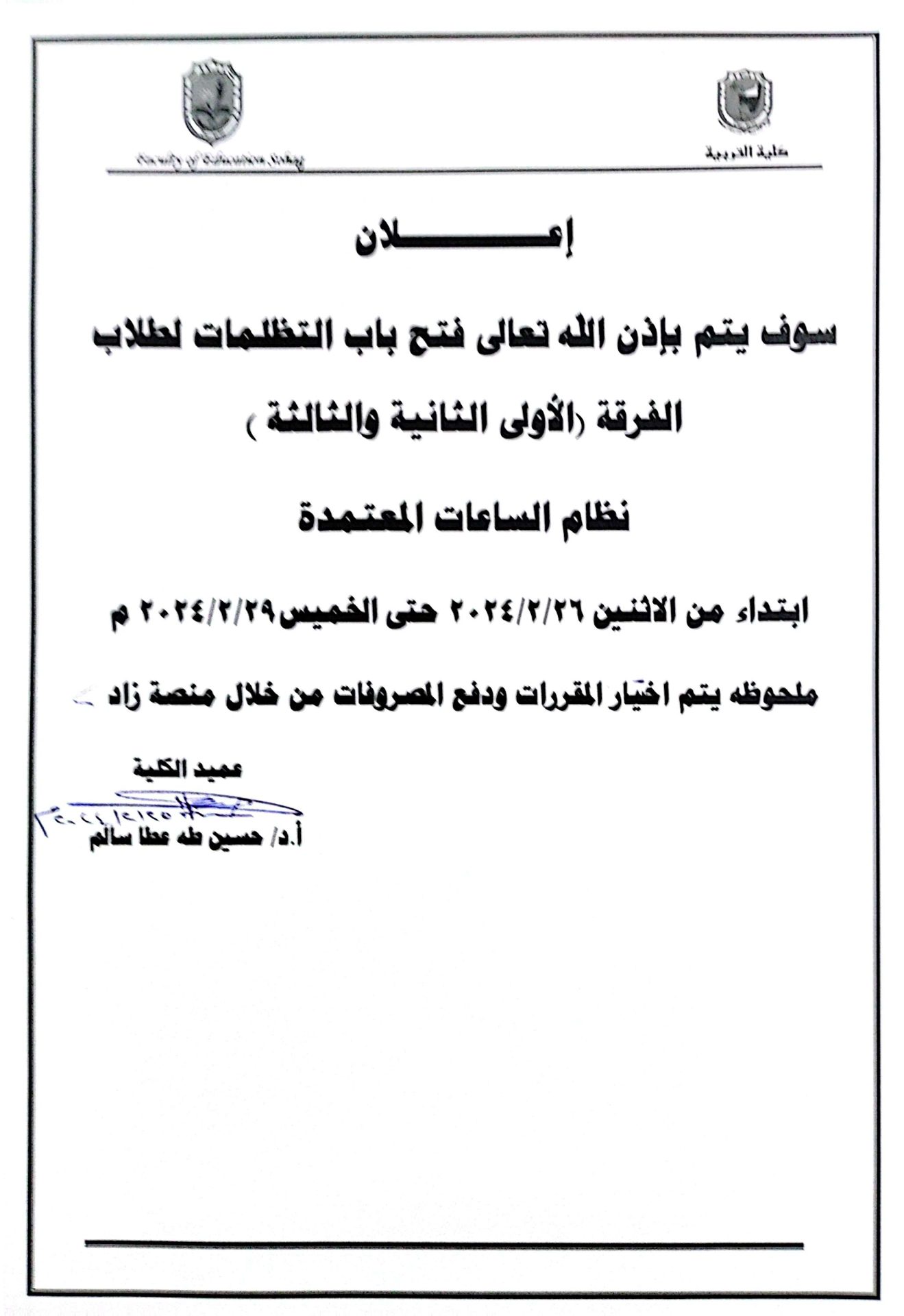 فتح باب التظلمات لطلاب الفرق (الأولي والثانية والثالثة) نظام الساعات المعتمدة