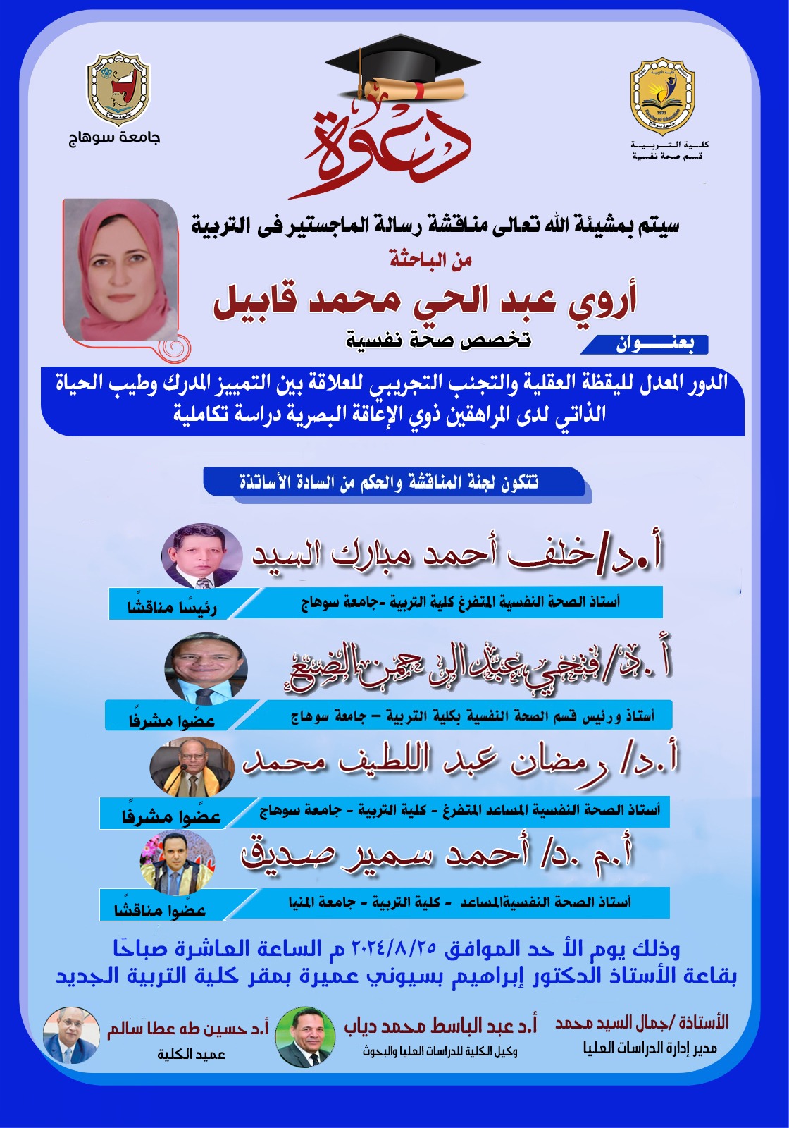 يتقدم قسم الصحة النفسية بكلية التربية جامعة سوهاج بتهنئة الباحثة/ اروي عبد الحي محمد قابيل ؛ بمناسبة حصولها علي درجة الماجستير في التربية تخصص الصحة النفسية