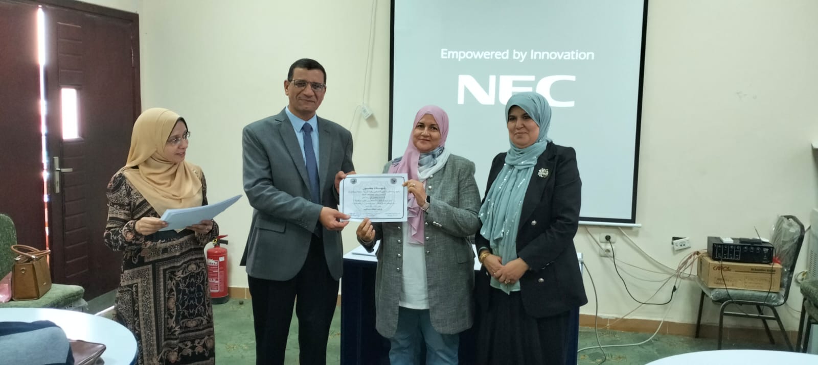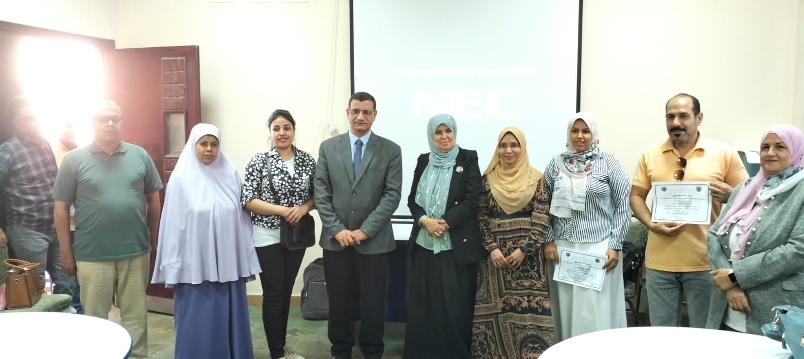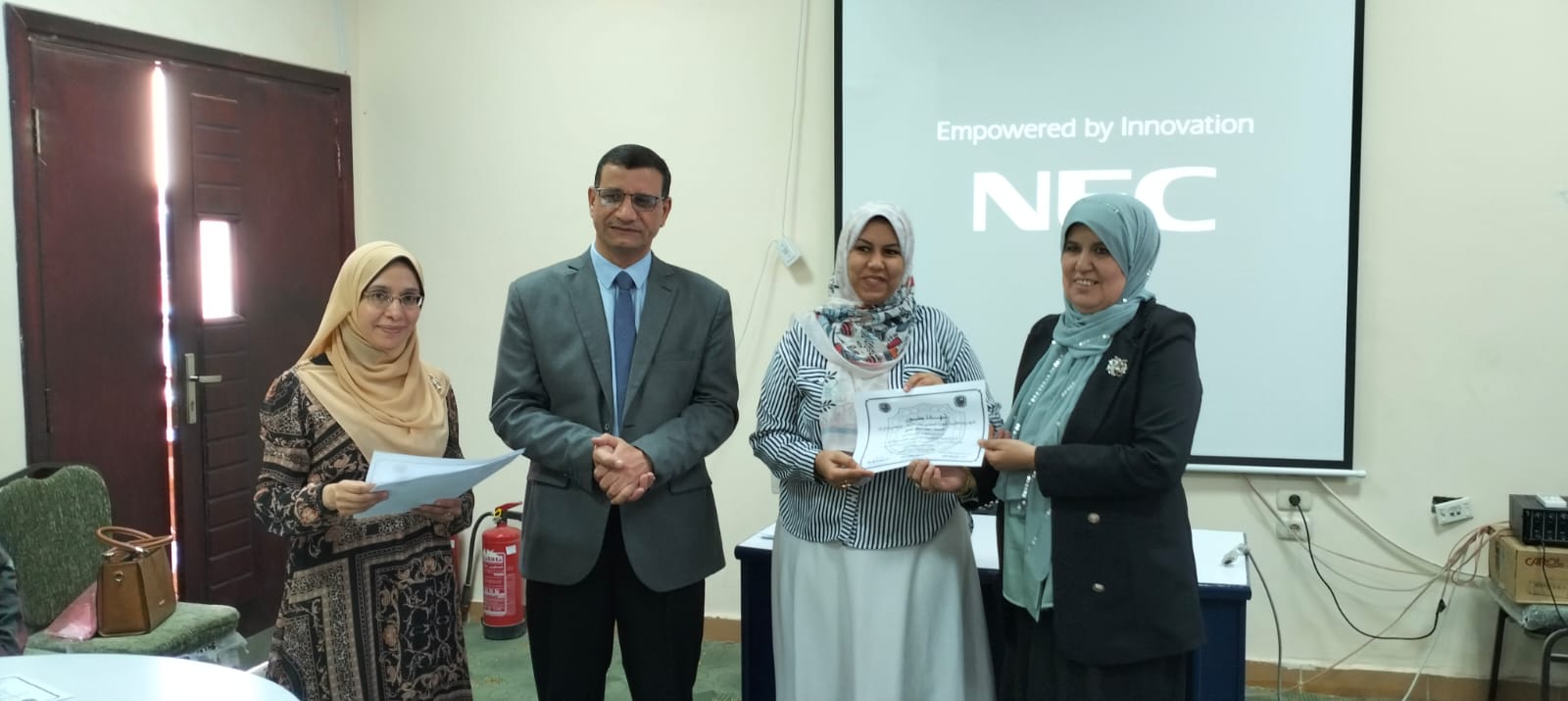 وقد حضر السيد عميد الكلية ووكيل الكلية لخدمة المجتمع واشادو بأهمية دور المعلم والموجه في العملية التعليمة ورغبتهم في التطوير من قدراتهم لمواكبة التطور وتم توزيع شهادات للحضور على وعد بعقد دورات وورش عمل تدريبية لجميع التخصصات لتعم الفائدة على الجميع ويحقق مركز التنمية المهنية اهم الأهداف الخاصة بالمركز .