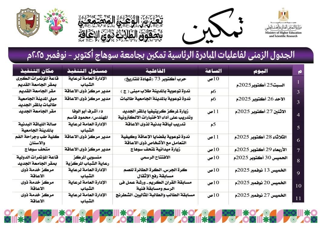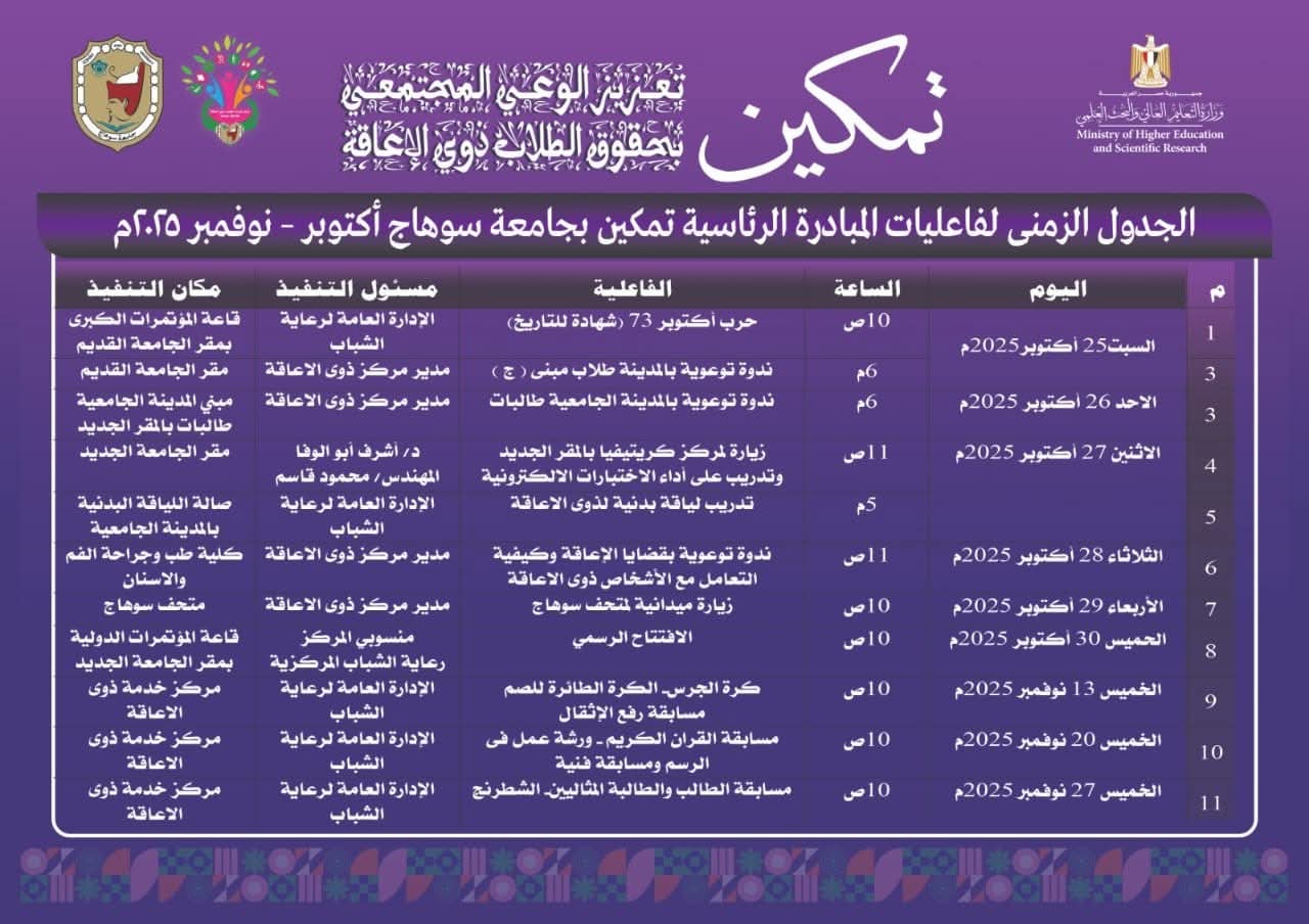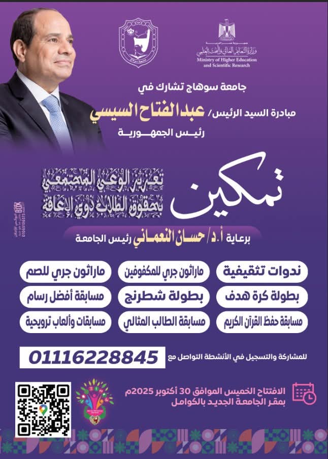 جامعة سوهاج بيئة جامعية مستدامة وميسرة وأكثر شمولا للدمج والتمكين بشتي أنواعه للطلاب ذوي الإعاقة؛ والجاهزية المؤسسية لتنفيذ أنشطة مبادرة تمكين