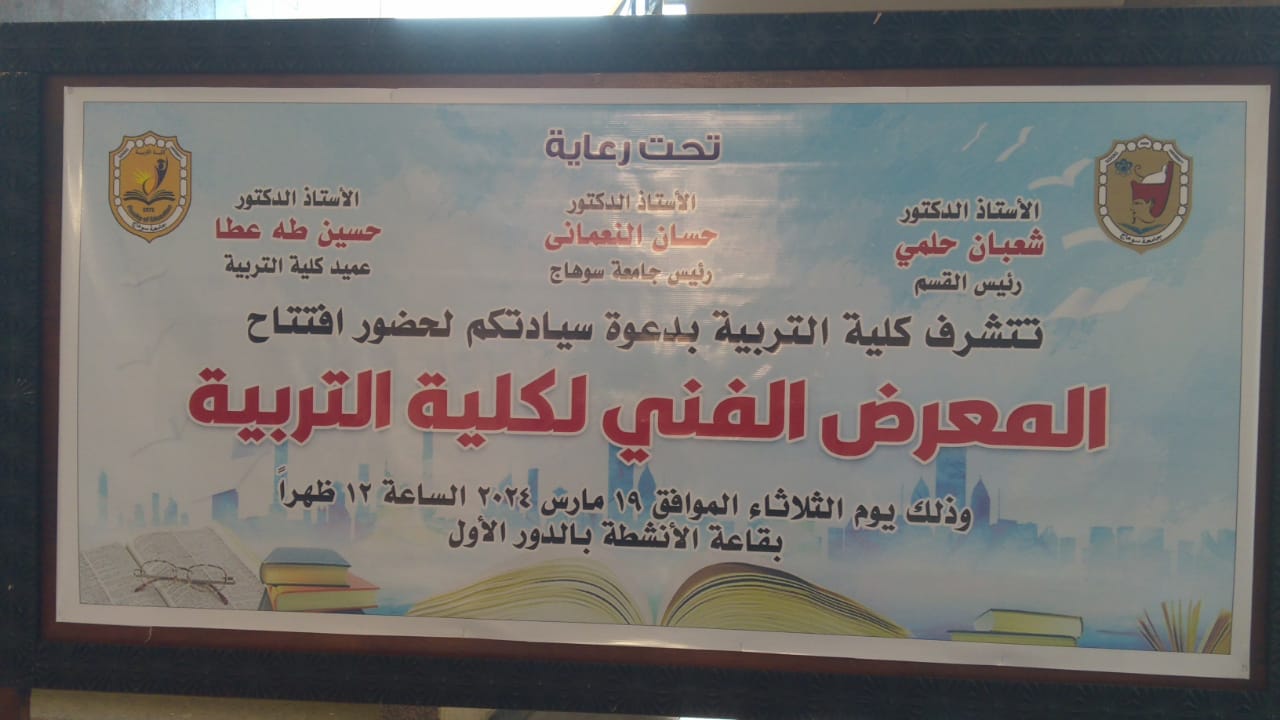 افتتح الدكتور حسان النعماني رئيس جامعة سوهاج معرض الأعمال الفنية والجدارية لطلاب كلية التربية، بحضور الدكتور حسين طه القائم بعمل عميد الكلية، الدكتور عبدالباسط دياب، الدكتور عماد صموئيل وكلاء الكلية، الدكتور محمود عباس عميد الكلية الأسبق، اللواء طارق حافظ مدير إدارة الأمن الجامعي وعدد من أعضاء هيئة التدريس والعاملين بالكلية.