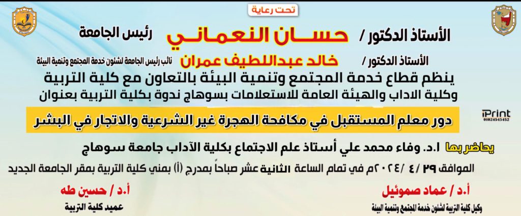 ندوة بعنوان (دور معلم المستقبل في مكافحة الهجرة غير الشرعية والاتجار في البشر) ندوة بعنوان (دور معلم المستقبل في مكافحة الهجرة غير الشرعية والاتجار في البشر) تصفّح المقالات فعاليات ندوة (الابتكار التدريسي من الفكرة إلي تسجيل براءة الاختراع)استمرار فعاليات استكمال ملفات معايير الجودة