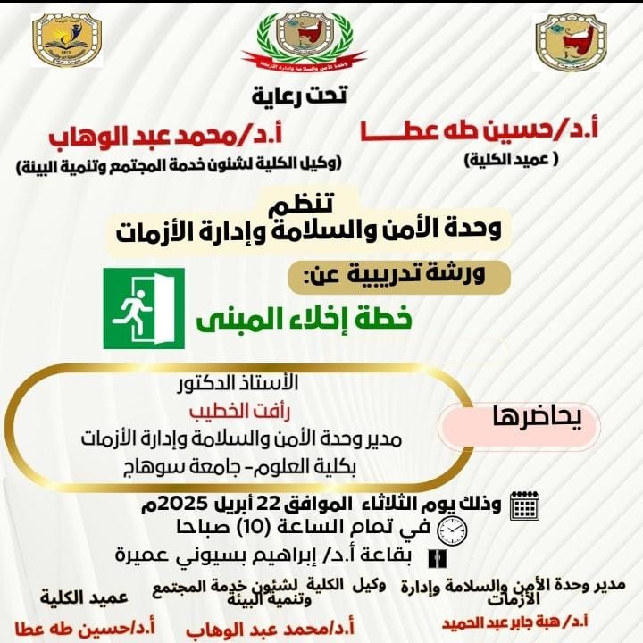 يحاضر فيها السيد أ.د/ رأفت الخطيب “مدير وحدة الأمن والسلامة وإدارة الأزمات بكلية العلوم جامعة سوهاج”