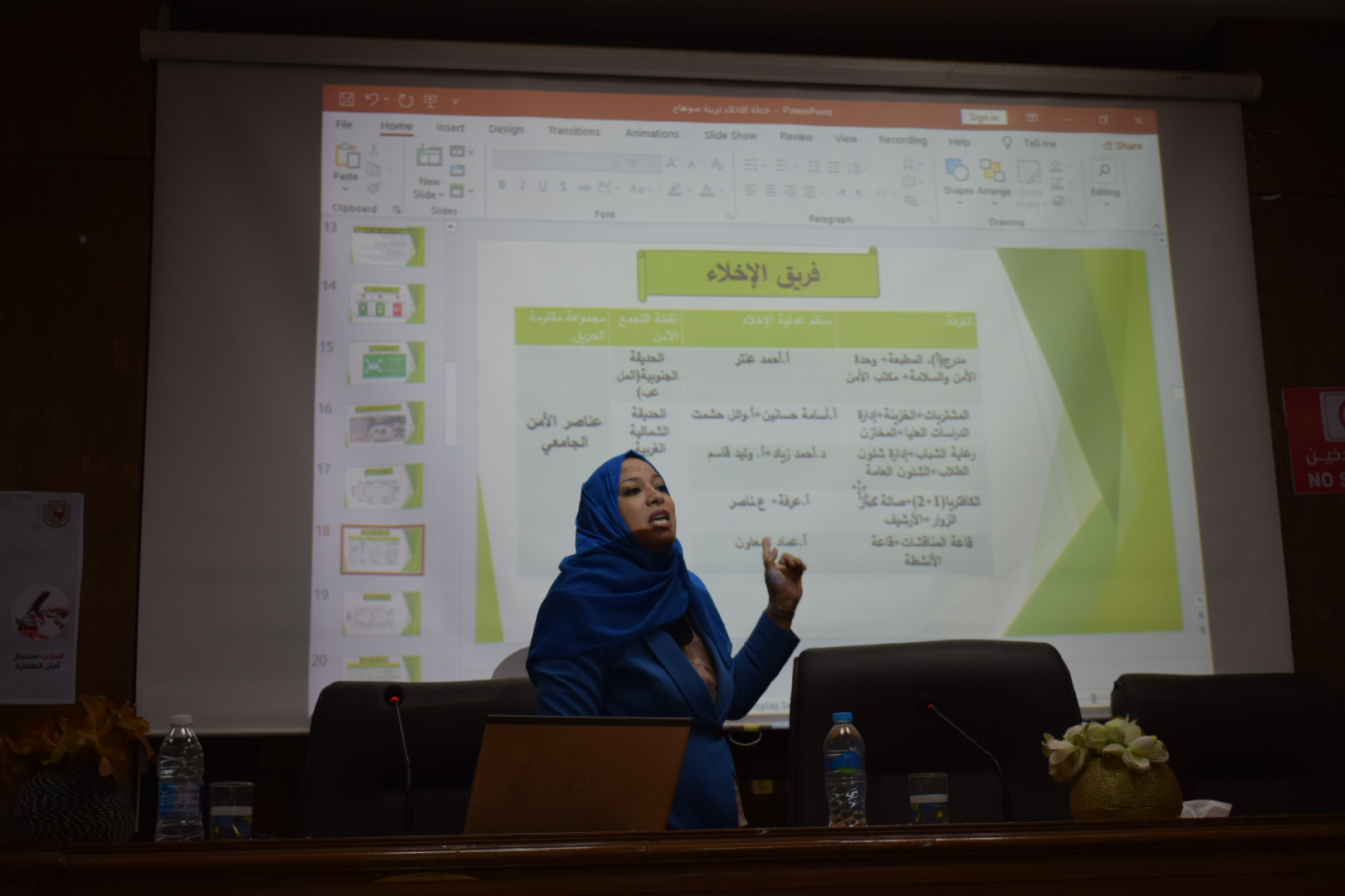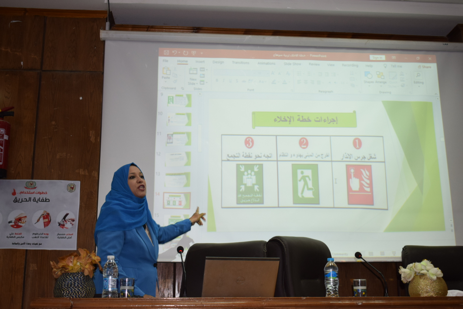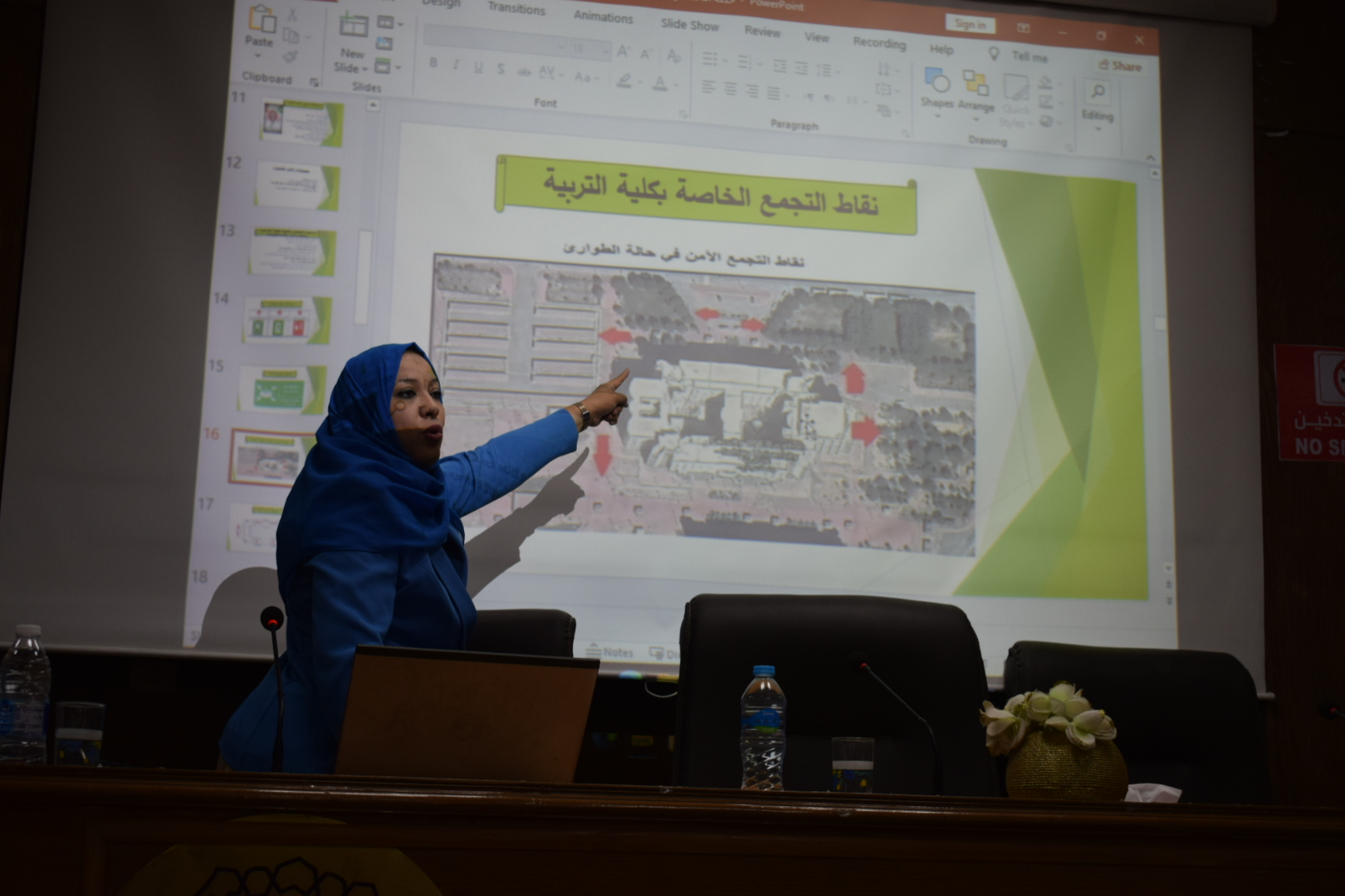 وتناولت الورشة التدريب على كيفية الاخلاء في حالات الطواريء والتعرف على حالات الطوارئ وكيفية الاخلاء وما هي نقاط التجمع الأمن بالكلية وكيفية استخدام طفاية الحريق وانتهت الورشة بعرض عملي لخطة اخلاء المبني.