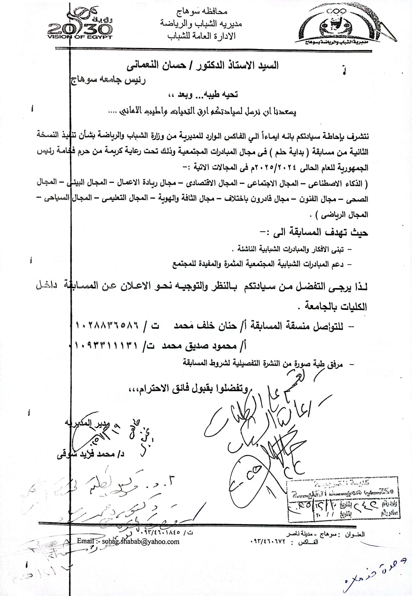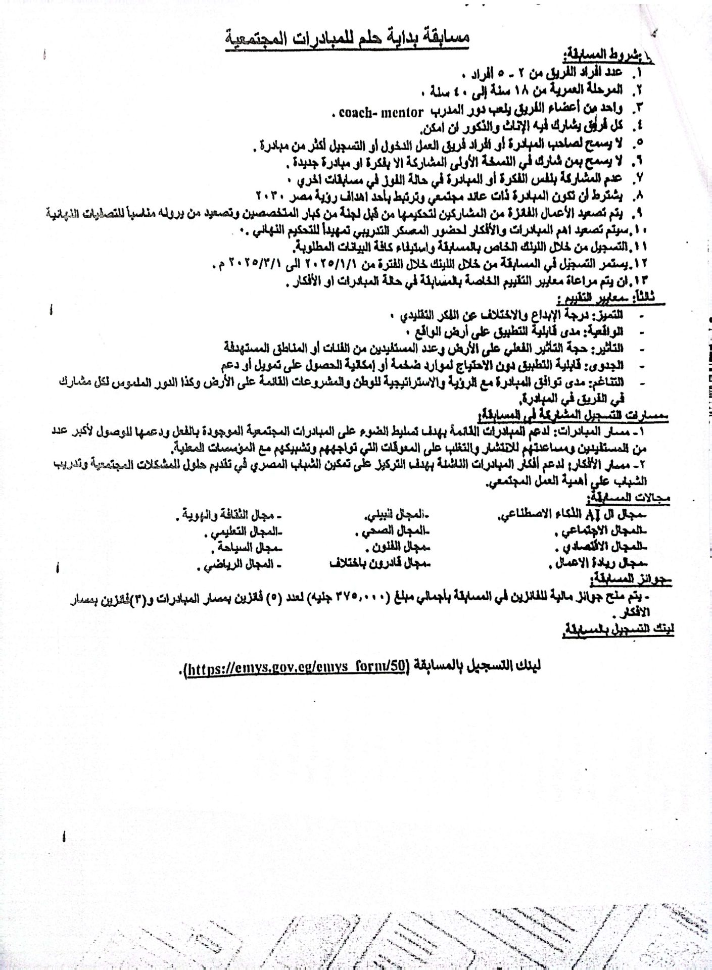 أعلنت وزارة الشباب والرياضة عن رعاية قرينة رئيس الجمهورية للنسخة الثانية من مسابقة “بداية حلم”، والتي تنفذها الوزارة من خلال الإدارة المركزية لتنمية الشباب” الإدارة العامة للبرامج والأنشطة الجامعية “للفئة العمرية من (18- 40) عام.