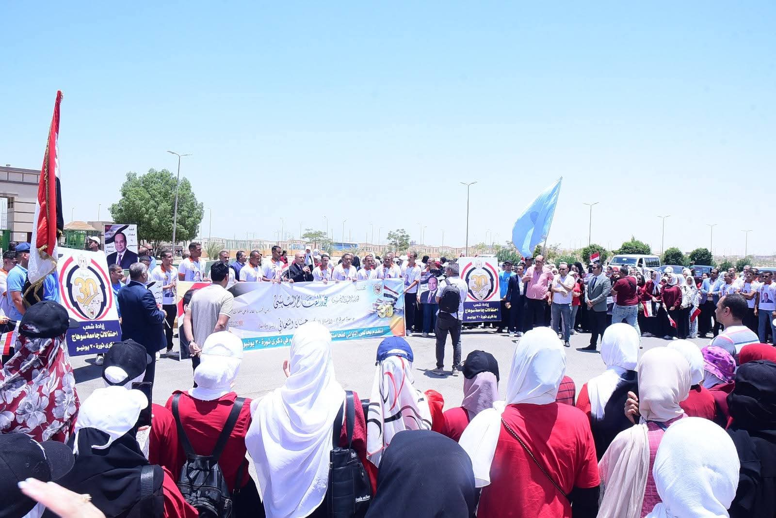 وانطلقت المسيرة من أمام مبنى المركز الدولي للمؤتمرات بمقر الجامعة الجديد، وصولاً إلى البوابة الرئيسية، وسط أجواء احتفالية حماسية، تخللتها الأغاني الوطنية والهتافات المؤيدة للدولة المصرية، واختُتمت بكلمة رئيس الجامعة أمام الطلاب، احتفالًا بهذا اليوم المجيد الذي يمثل رمزًا للإرادة الشعبية والتلاحم الوطني.