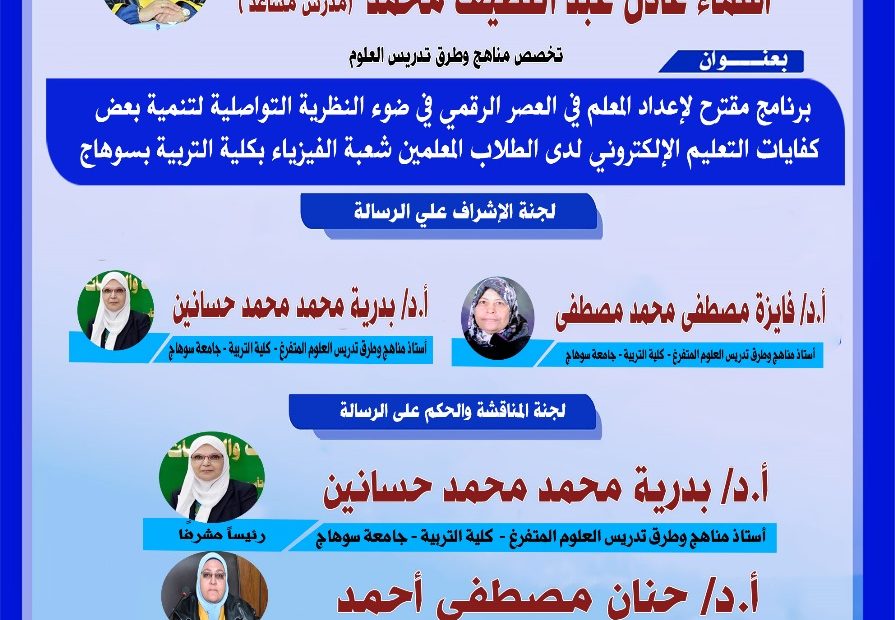 دعوة لحضور مناقشة رسالة الماجستير بقسم أصول التربية للباحثة/ تماضر أنور