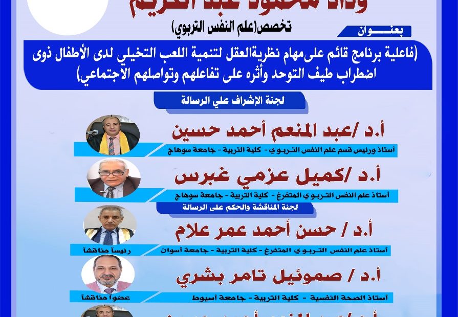 دعوة لحضور مناقشة رسالة الماجستير تخصص الإدارة التعليمية للباحثة/ مروى محمد تتشرف كلية التربية بجامعة سوهاج بدعوة السادة الحضور الكرام لحضور مناقشة رسالة الماجستير في التربية (تخصص الإدارة التعليمية) المقدمة من الباحثة / مروى محمد عبد اللاه محمود وذلك بعنوان:… اقرأ المزيد »دعوة لحضور مناقشة رسالة الماجستير تخصص الإدارة التعليمية للباحثة/ مروى محمد