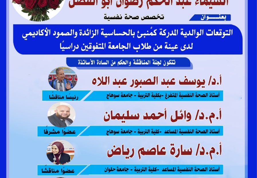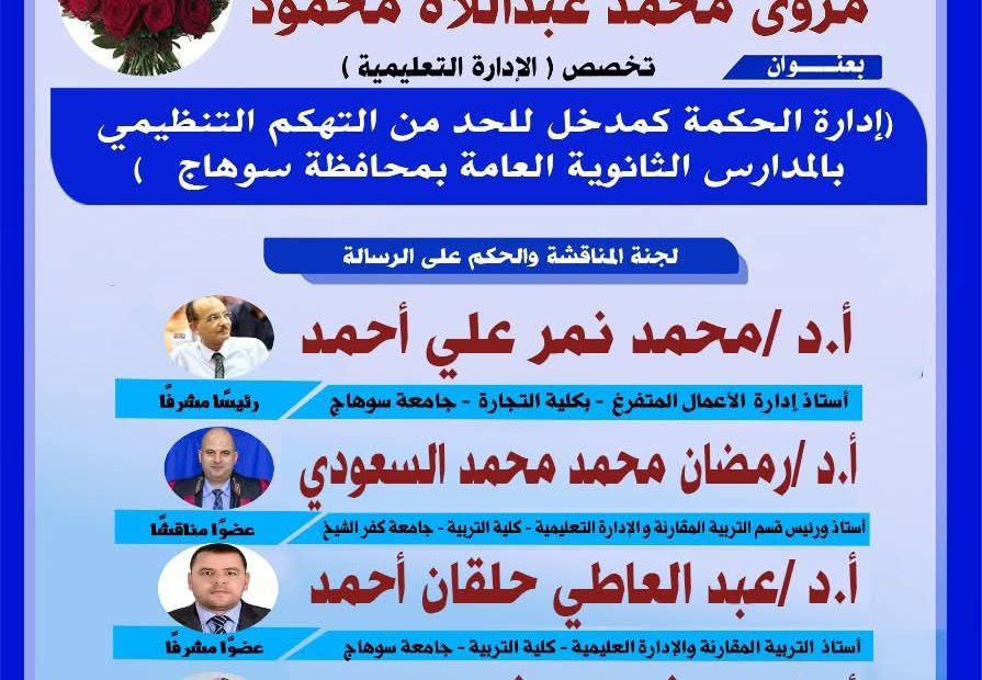 دعوة لحضور مناقشة رسالة الماجستير تخصص الإدارة التعليمية للباحثة/ مروى محمد