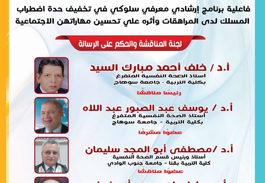 دعوة لمناقشة رسالة دكتوراه الفلسفة في التربية تخصص”الصحة النفسية” للباحثة/ أمل محمد فهمي