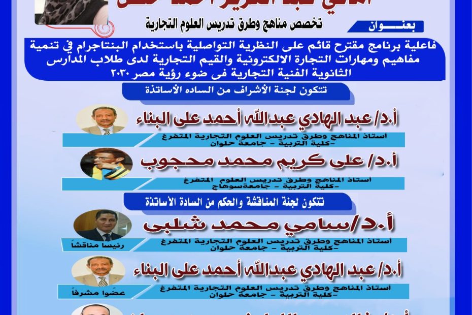 دعوة لحضور مناقشة رسالة الدكتوراه للباحثة/ أماني عبدالعزيز أحمد “تحصص المناهج وطرق التدريس” وذلك بمشيئة الله تعالي يوم السبت الموافق 23 نوفمبر 2024م في تمام الساعة العاشرة صباحاً بقاعة الاستاذ الدكتور ابراهيم بسيوني بمقر كلية التربية بالكوامل