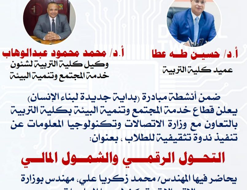 ندوة تثقيفية بعنوان: التحول الرقمي والشمول المالي ضمن فعاليات مبادرة “بداية” لبناء الإنسان المصري في إطار المبادرة الرئاسية “بداية جديدة لبناء الإنسان المصري” التي أطلقها فخامة الرئيس عبد الفتاح السيسي، وتحت رعاية معالي الأستاذ الدكتور حسان النعماني “رئيس جامعة سوهاج”،… اقرأ المزيد »ندوة تثقيفية بعنوان: التحول الرقمي والشمول المالي ضمن فعاليات مبادرة “بداية” لبناء الإنسان المصري